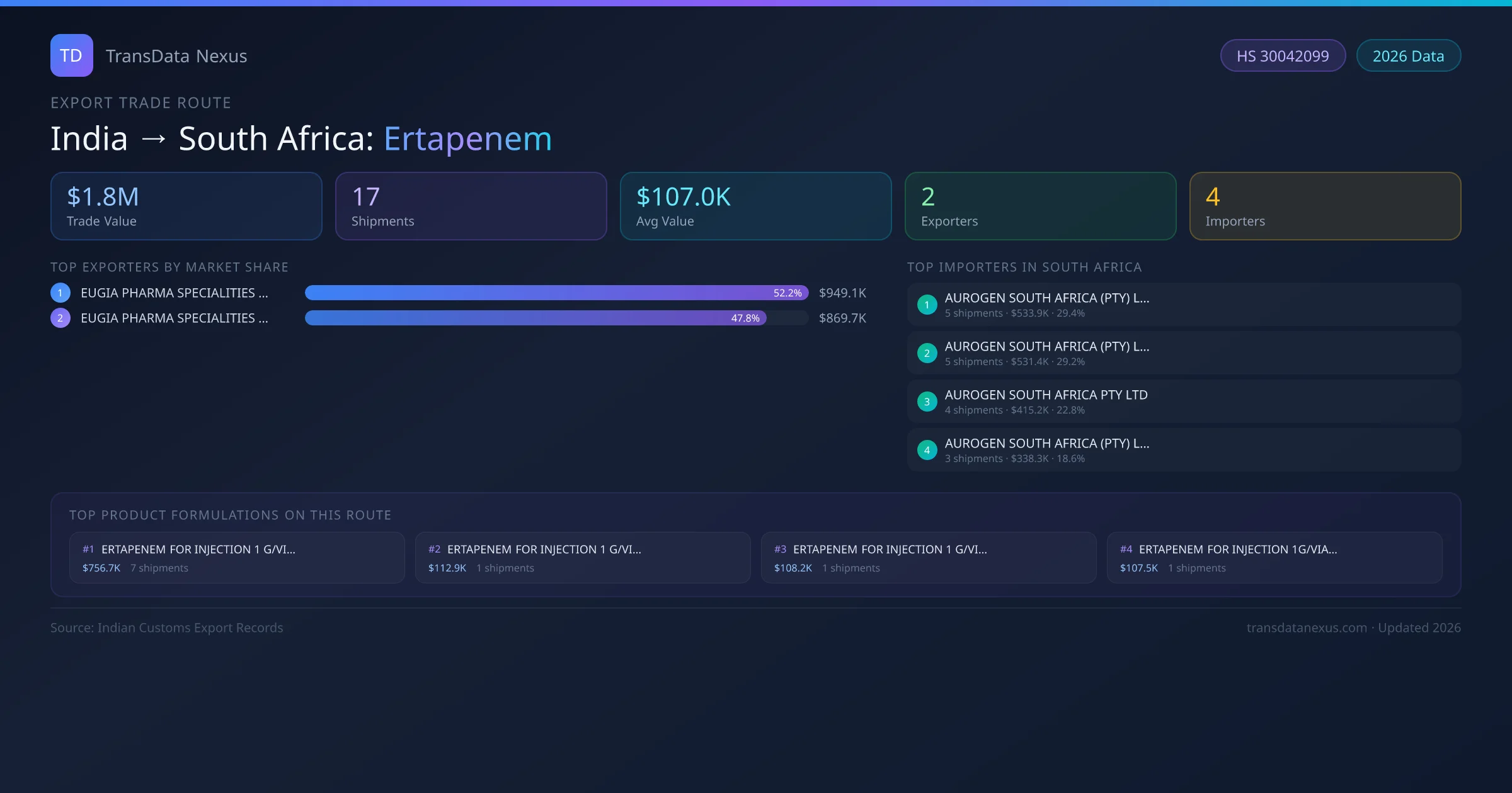 India exports Ertapenem to South Africa worth approximately $1.8M USD across 17 recorded shipments. The average value per shipment is $107.0K USD.