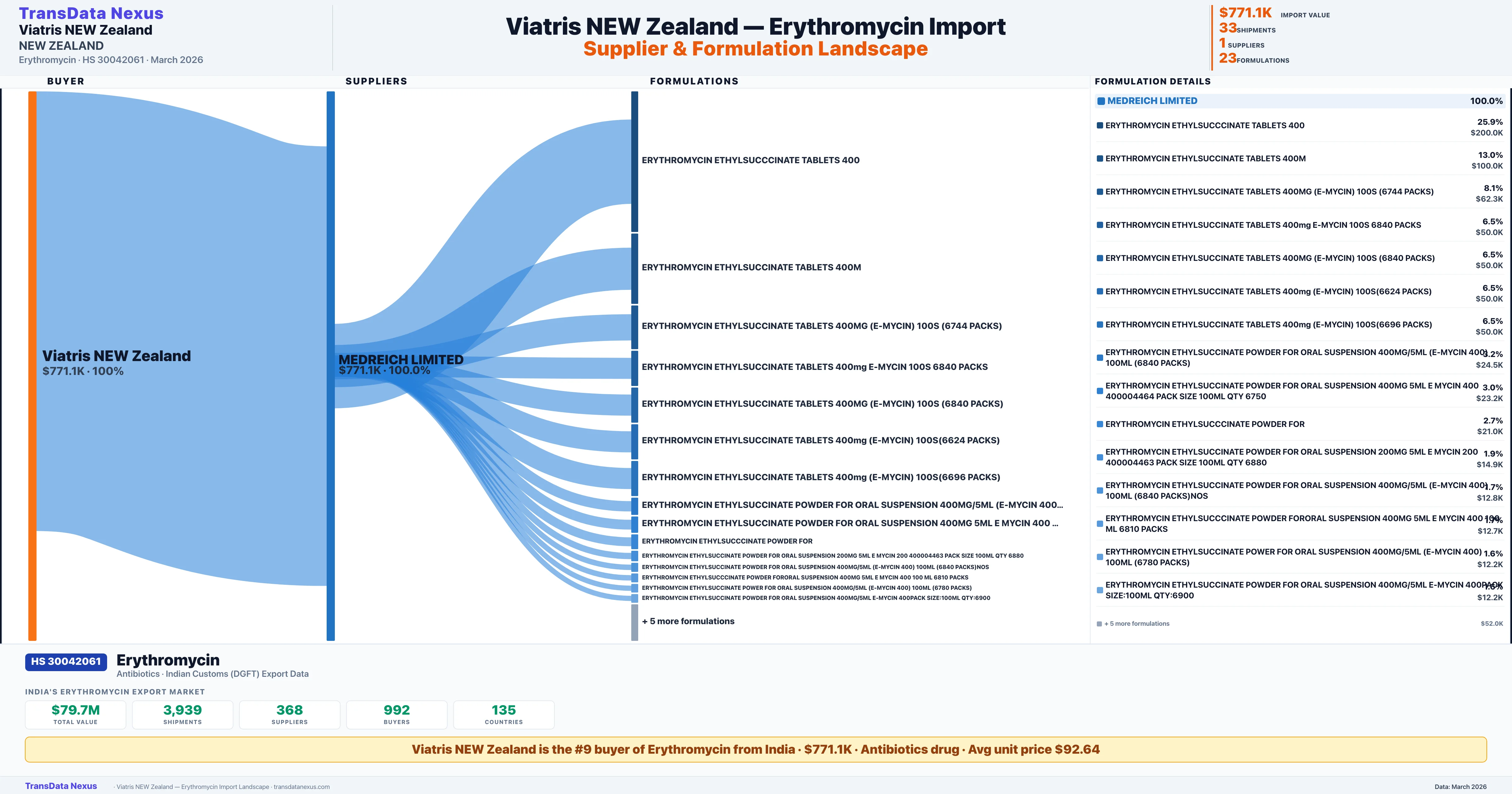 VIATRIS NEW ZEALAND sources Erythromycin from 1 verified Indian supplier: MEDREICH LIMITED ($771.1K, 100.0%). This is based on 33 customs records.