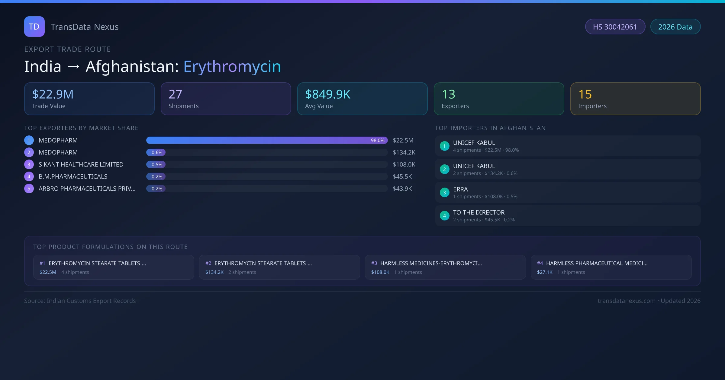 - 1.Route Identification: India to Afghanistan export trade corridor identified from Indian Customs (DGFT) records for Erythromycin.