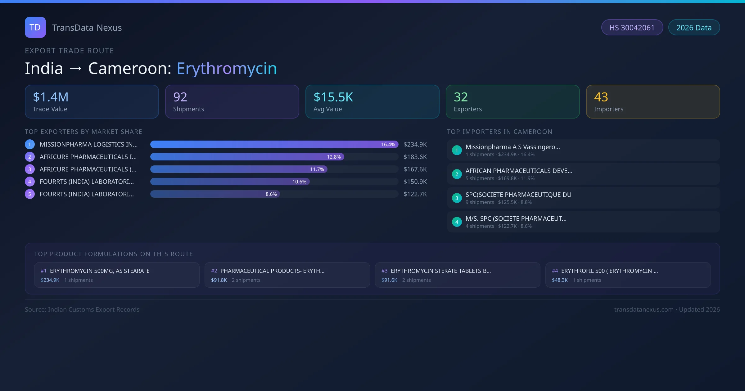 - 1.Route Identification: India to Cameroon export trade corridor identified from Indian Customs (DGFT) records for Erythromycin.