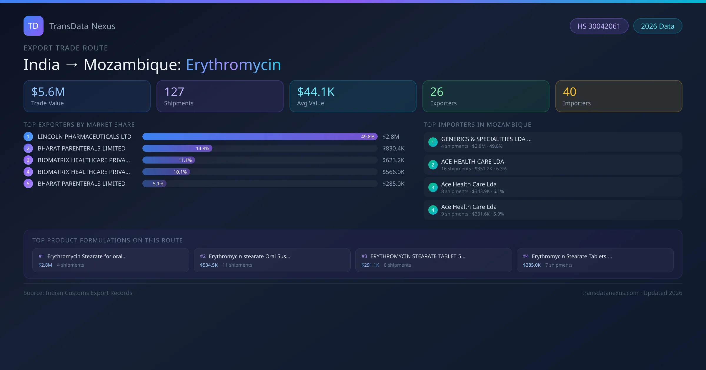 The India to Mozambique Erythromycin corridor is one of India's established pharmaceutical export routes, with 127 shipments documented worth a combined $5.6M USD. The route is dominated by LINCOLN PHARMACEUTICALS LTD, which alone accounts for roughly 50% of all export value, reflecting the consolidated nature of India's erythromycin manufacturing sector.