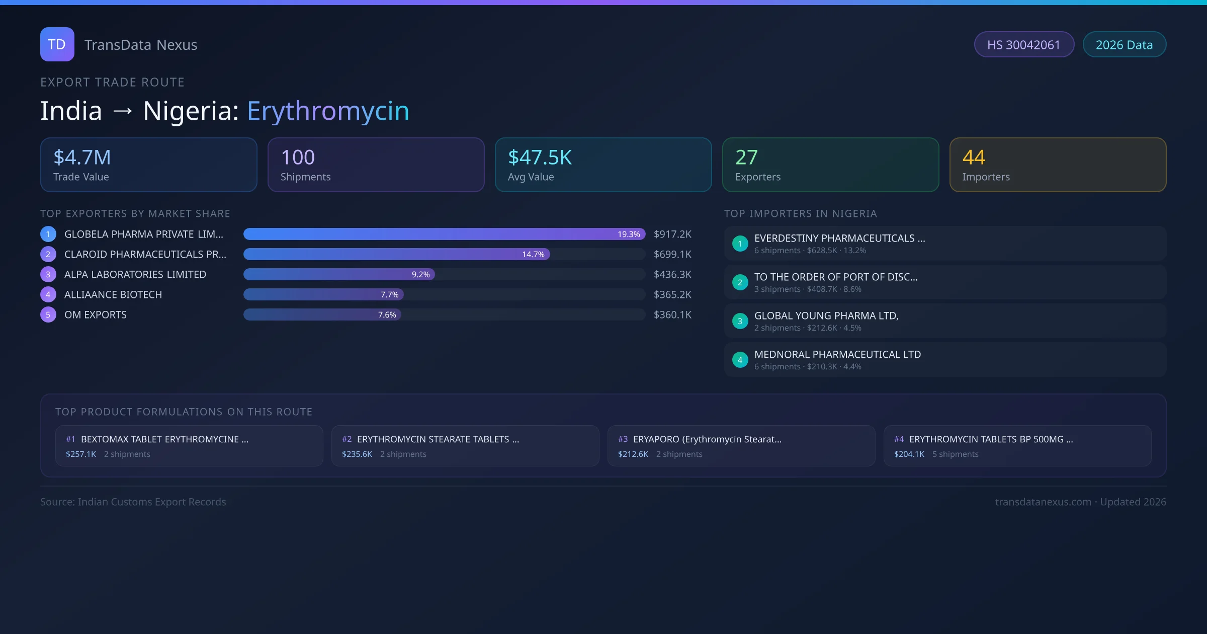India has recorded 100 verified shipments of Erythromycin exported to Nigeria, representing a combined trade value of $4.7M USD. This corridor is served by 27 active Indian exporters, with an average shipment value of $47.5K USD. The leading Indian exporter is GLOBELA PHARMA PRIVATE LIMITED, which accounts for 19% of total export value with 11 shipments worth $917.2K USD. On the buying side, EVERDESTINY PHARMACEUTICALS LIMITED is the largest importer in Nigeria with $628.5K USD in purchases. The top 3 suppliers — GLOBELA PHARMA PRIVATE LIMITED, CLAROID PHARMACEUTICALS PRIVATE LIMITED, ALPA LABORATORIES LIMITED — together control 43% of total trade value on this route. All data sourced from Indian Customs (DGFT) shipping bill records. Values reported in FOB USD.