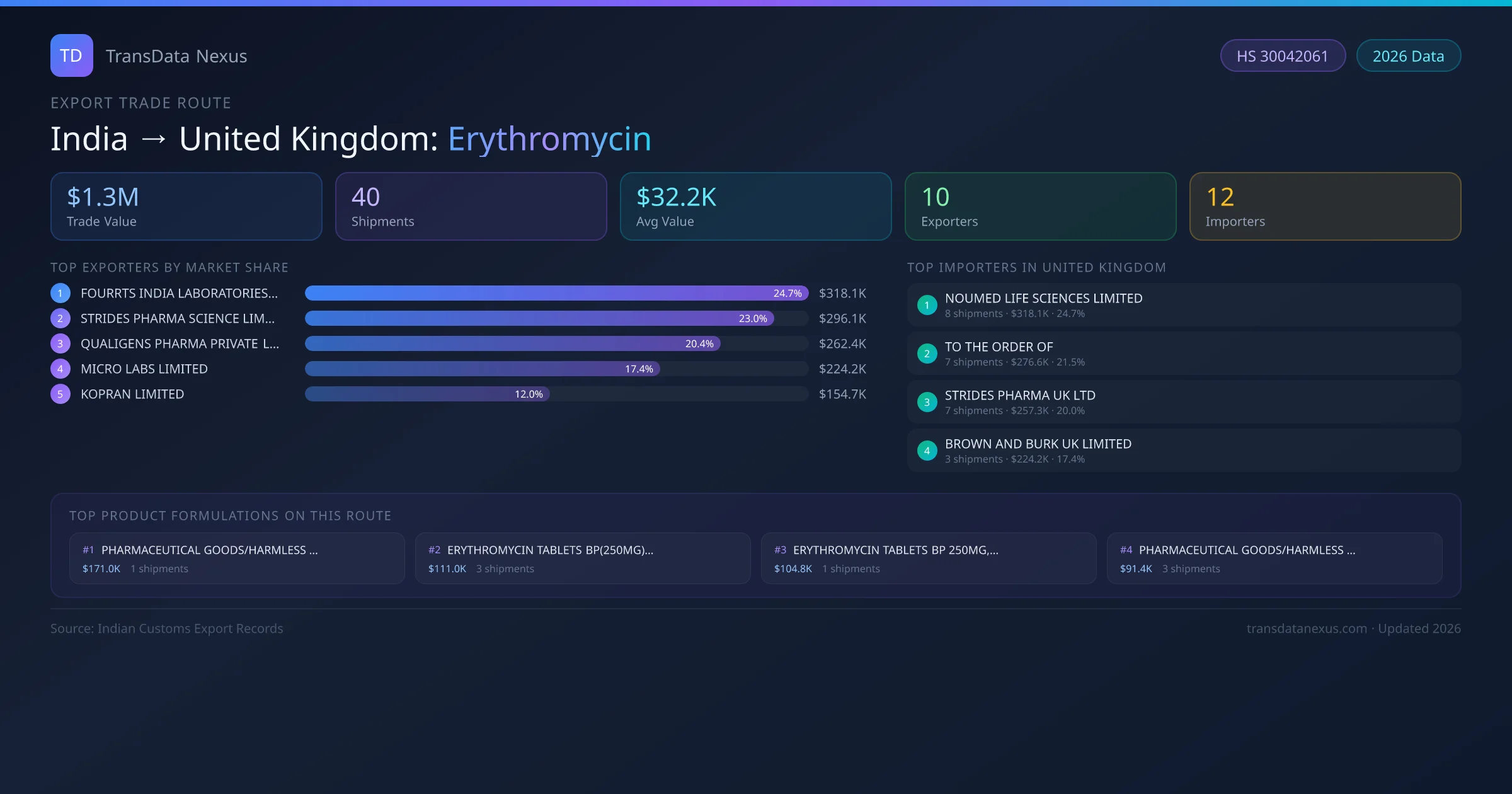 India has recorded 40 verified shipments of Erythromycin exported to United Kingdom, representing a combined trade value of $1.3M USD. This corridor is served by 10 active Indian exporters, with an average shipment value of $32.2K USD. The leading Indian exporter is FOURRTS INDIA LABORATORIES PRIVATE LIMITED, which accounts for 25% of total export value with 8 shipments worth $318.1K USD. On the buying side, NOUMED LIFE SCIENCES LIMITED is the largest importer in United Kingdom with $318.1K USD in purchases. The top 3 suppliers — FOURRTS INDIA LABORATORIES PRIVATE LIMITED, STRIDES PHARMA SCIENCE LIMITED, QUALIGENS PHARMA PRIVATE LIMITED — together control 68% of total trade value on this route. All data sourced from Indian Customs (DGFT) shipping bill records. Values reported in FOB USD.