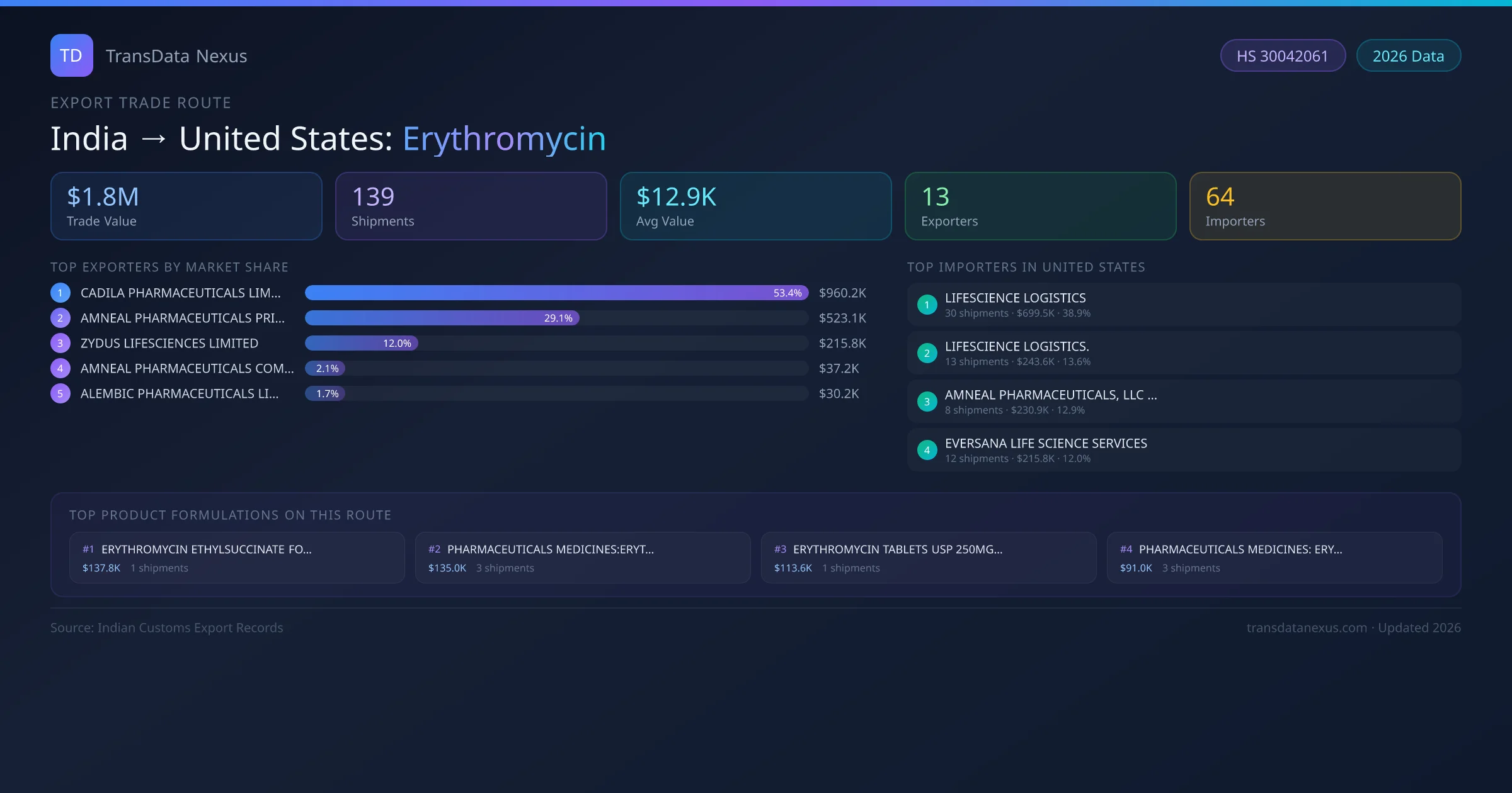India has recorded 139 verified shipments of Erythromycin exported to United States, representing a combined trade value of $1.8M USD. This corridor is served by 13 active Indian exporters, with an average shipment value of $12.9K USD. The leading Indian exporter is CADILA PHARMACEUTICALS LIMITED, which accounts for 53% of total export value with 44 shipments worth $960.2K USD. On the buying side, LIFESCIENCE LOGISTICS is the largest importer in United States with $699.5K USD in purchases. The top 3 suppliers — CADILA PHARMACEUTICALS LIMITED, AMNEAL PHARMACEUTICALS PRIVATE LIMITED, ZYDUS LIFESCIENCES LIMITED — together control 95% of total trade value on this route. All data sourced from Indian Customs (DGFT) shipping bill records. Values reported in FOB USD.