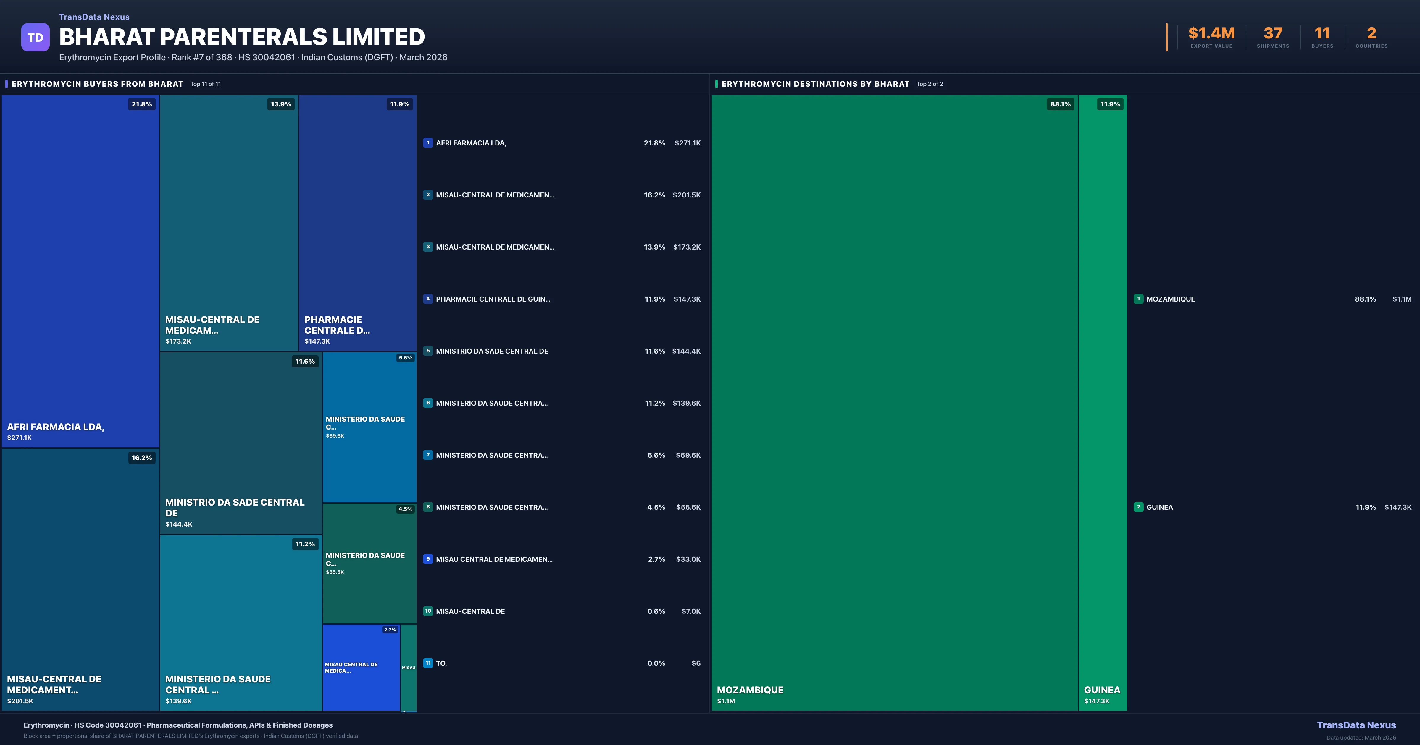 - 4.Verified Records: This page is backed by 37 individual customs records matching Bharat Parenterals Limited exporting Erythromycin, covering 13 formulations to 2 countries via 11 buyers.