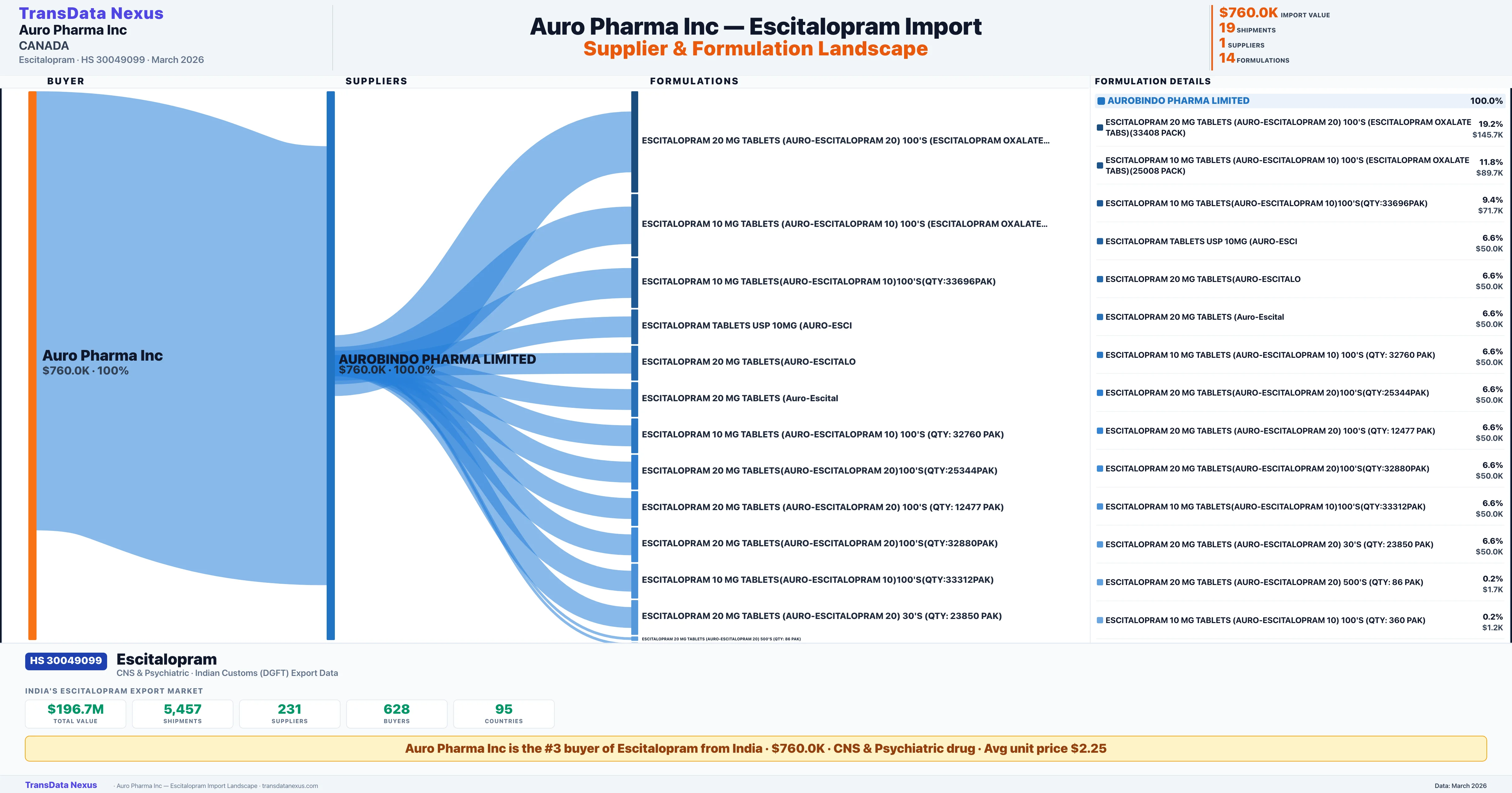 AURO PHARMA INC, sources Escitalopram from 1 verified Indian supplier: AUROBINDO PHARMA LIMITED ($760.0K, 100.0%). This is based on 19 customs records.