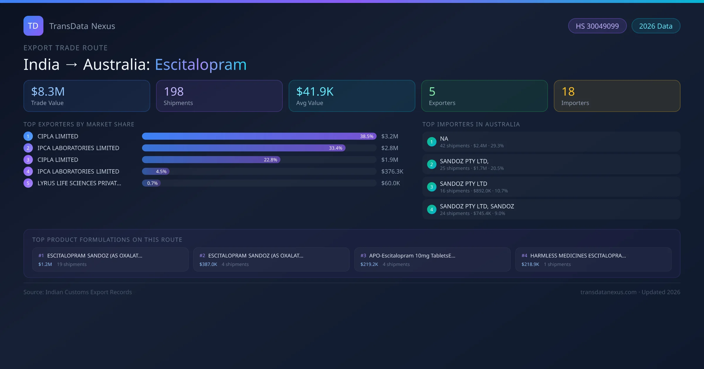 - 1.Route Identification: India to Australia export trade corridor identified from Indian Customs (DGFT) records for Escitalopram.