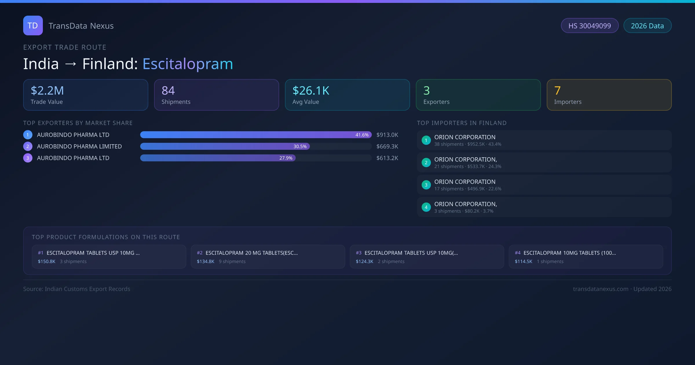 - 1.Route Identification: India to Finland export trade corridor identified from Indian Customs (DGFT) records for Escitalopram.
