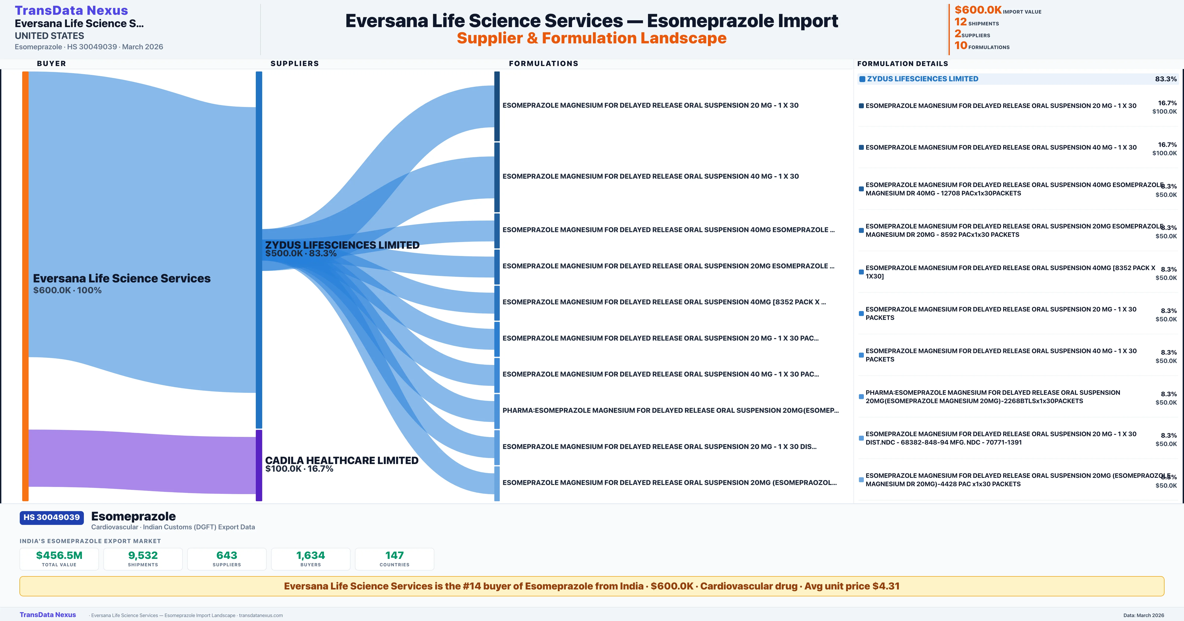 EVERSANA LIFE SCIENCE SERVICES sources Esomeprazole from 2 verified Indian suppliers: ZYDUS LIFESCIENCES LIMITED ($500.0K, 83.3%), CADILA HEALTHCARE LIMITED ($100.0K, 16.7%). This is based on 12 customs records.