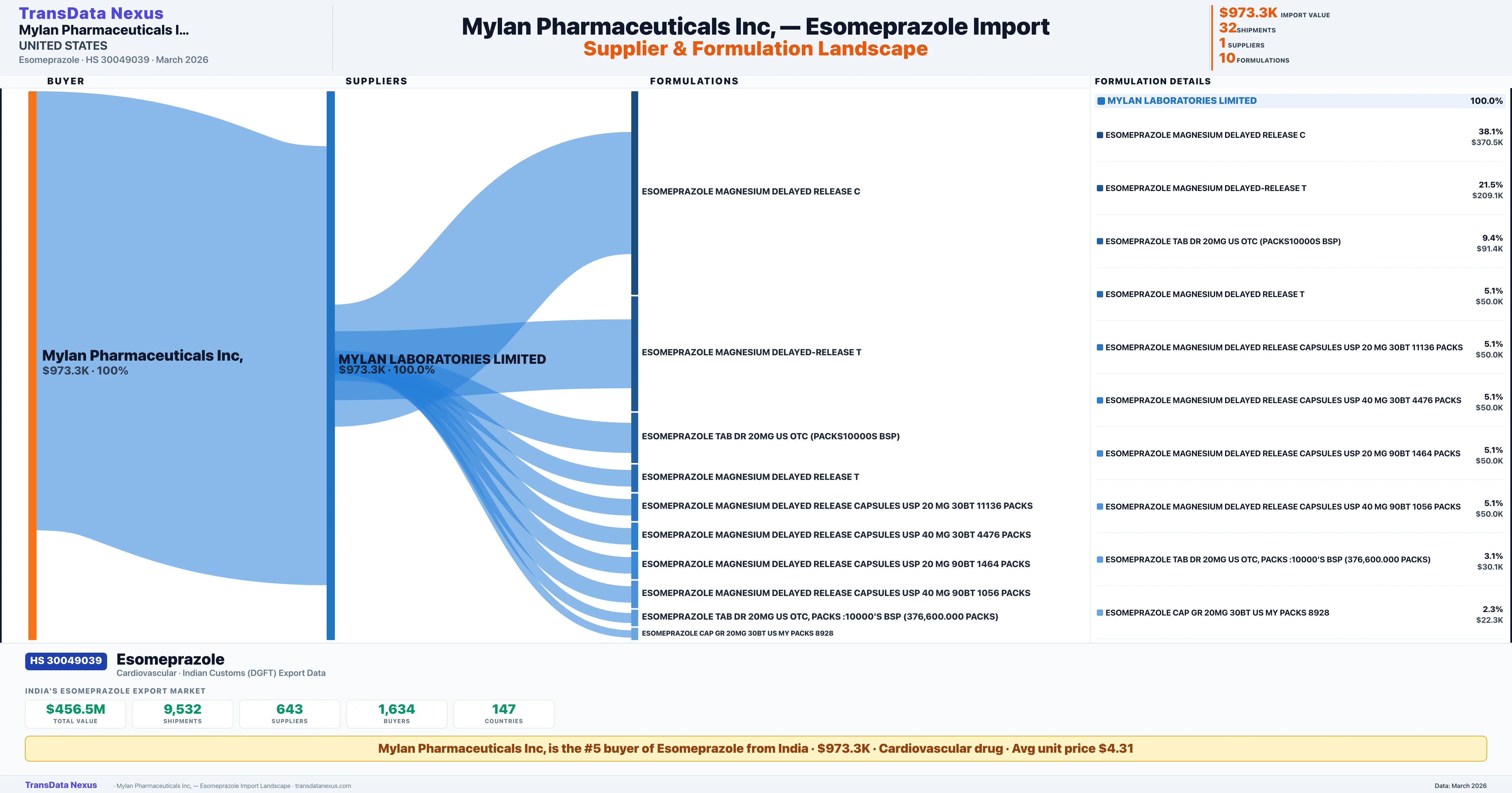 MYLAN PHARMACEUTICALS INC, sources Esomeprazole from 1 verified Indian supplier: MYLAN LABORATORIES LIMITED ($973.3K, 100.0%). This is based on 32 customs records.