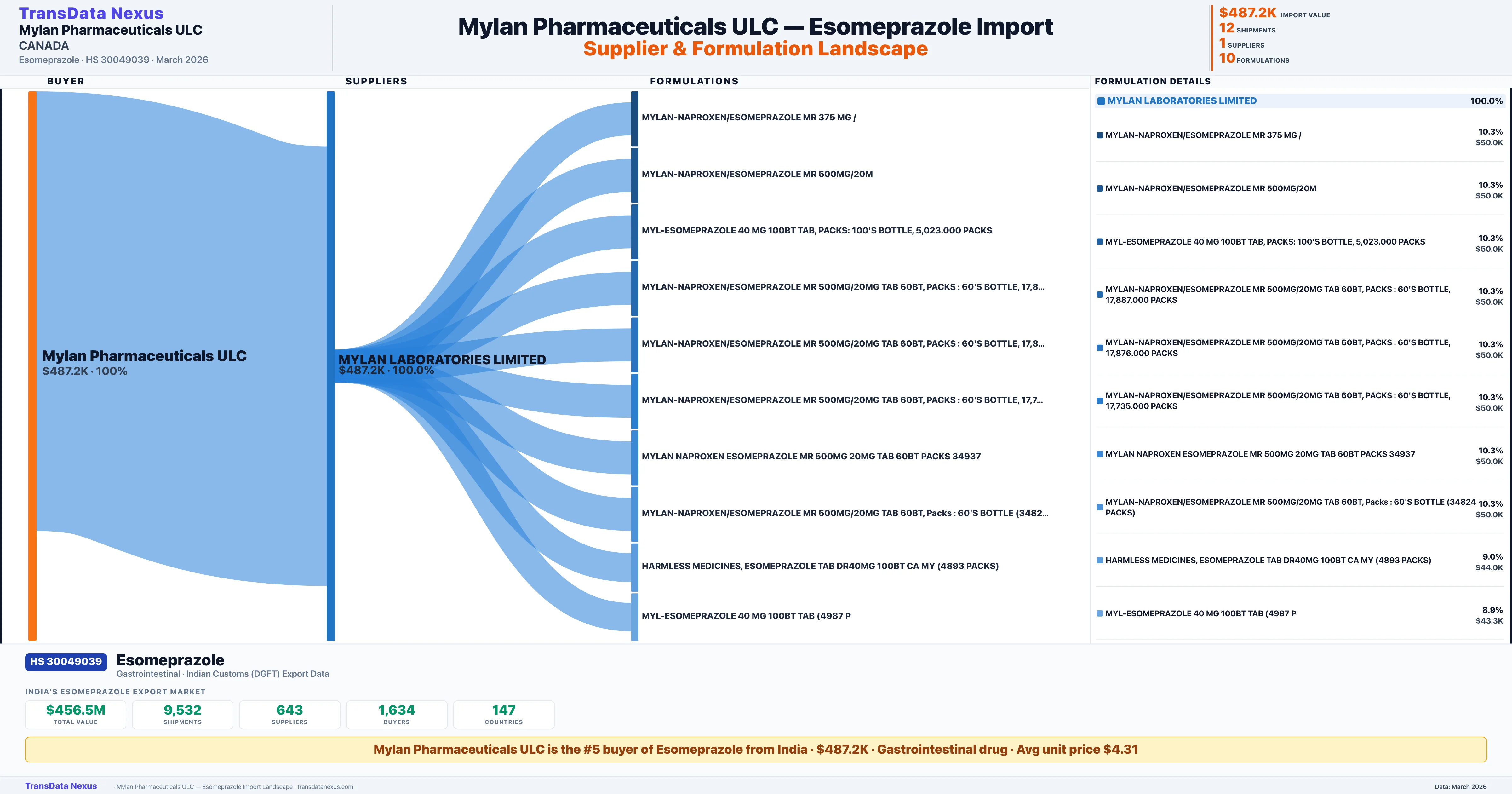 MYLAN PHARMACEUTICALS ULC, sources Esomeprazole from 1 verified Indian supplier: MYLAN LABORATORIES LIMITED ($487.2K, 100.0%). This is based on 12 customs records.