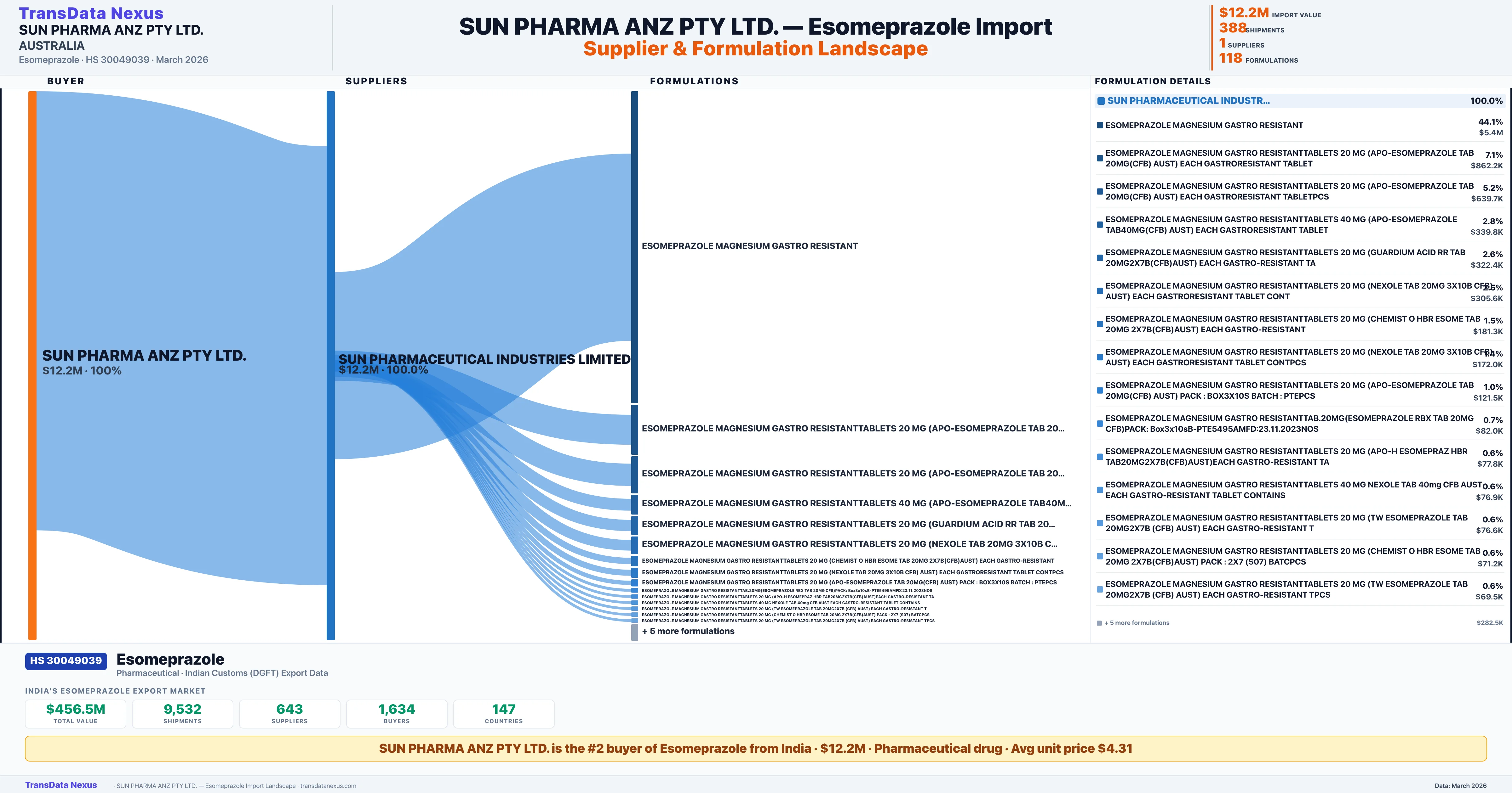 SUN PHARMA ANZ PTY LTD. sources Esomeprazole from 1 verified Indian supplier: SUN PHARMACEUTICAL INDUSTRIES LIMITED ($12.2M, 100.0%). This is based on 388 customs records.
