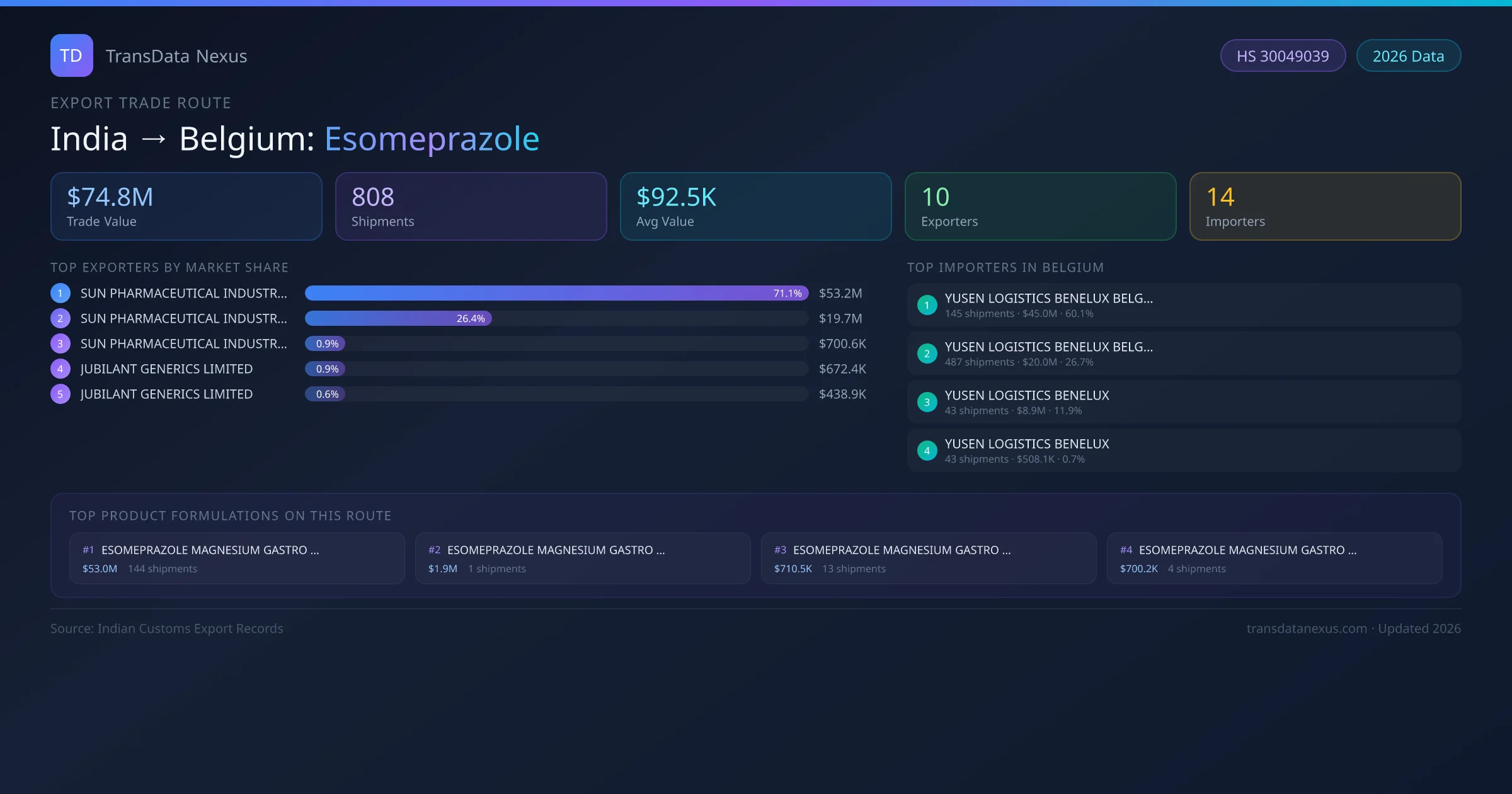 India has recorded 808 verified shipments of Esomeprazole exported to Belgium, representing a combined trade value of $74.8M USD. This corridor is served by 10 active Indian exporters, with an average shipment value of $92.5K USD. The leading Indian exporter is SUN PHARMACEUTICAL INDUSTRIES LIMITED , which accounts for 71% of total export value with 162 shipments worth $53.2M USD. On the buying side, YUSEN LOGISTICS BENELUX BELGIUM is the largest importer in Belgium with $45.0M USD in purchases. The top 3 suppliers — SUN PHARMACEUTICAL INDUSTRIES LIMITED , SUN PHARMACEUTICAL INDUSTRIES LIMITED, SUN PHARMACEUTICAL INDUSTRIES LTD — together control 98% of total trade value on this route. All data sourced from Indian Customs (DGFT) shipping bill records. Values reported in FOB USD.