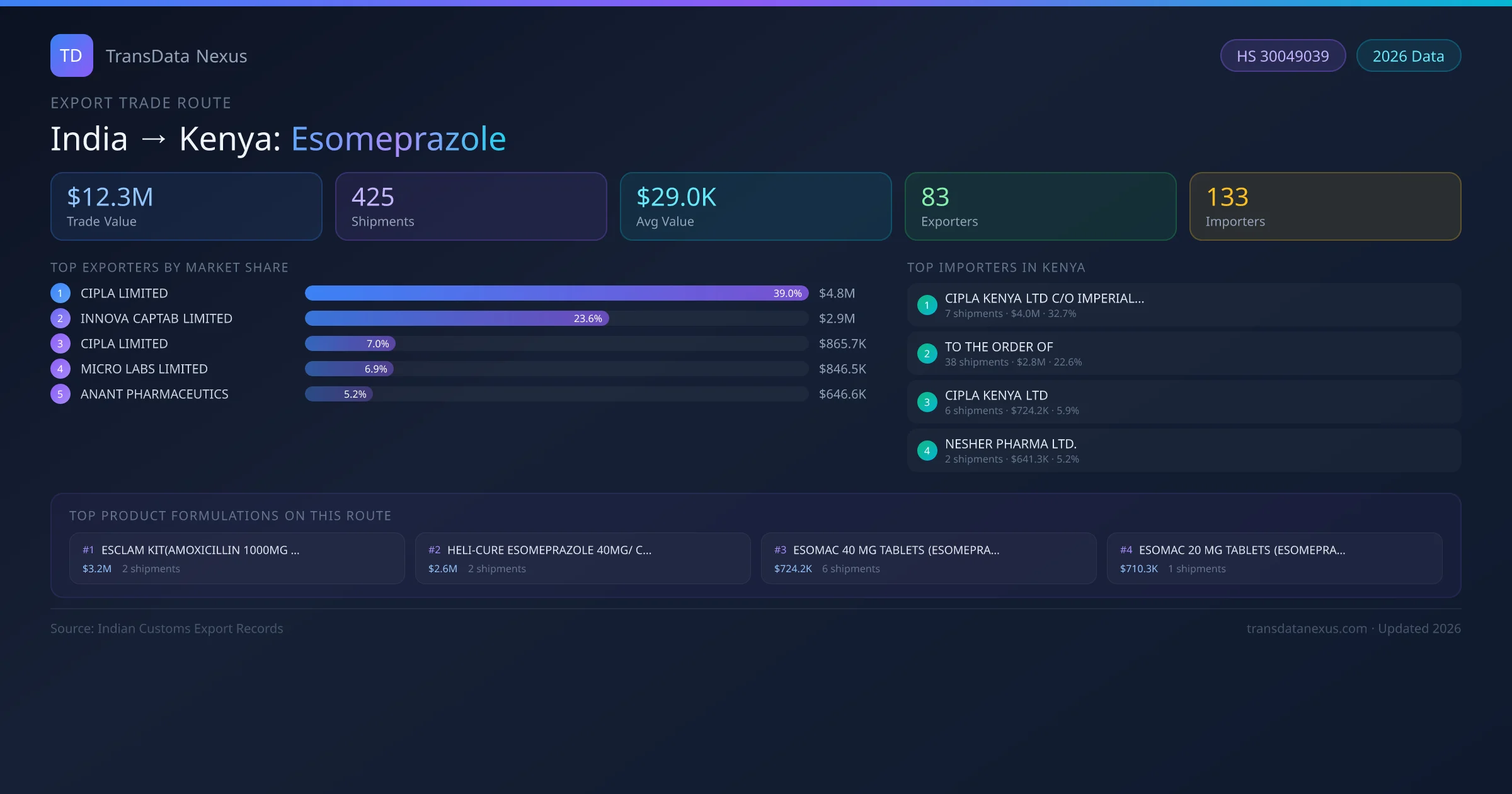 India exports Esomeprazole to Kenya worth approximately $12.3M USD across 425 recorded shipments. The average value per shipment is $29.0K USD.