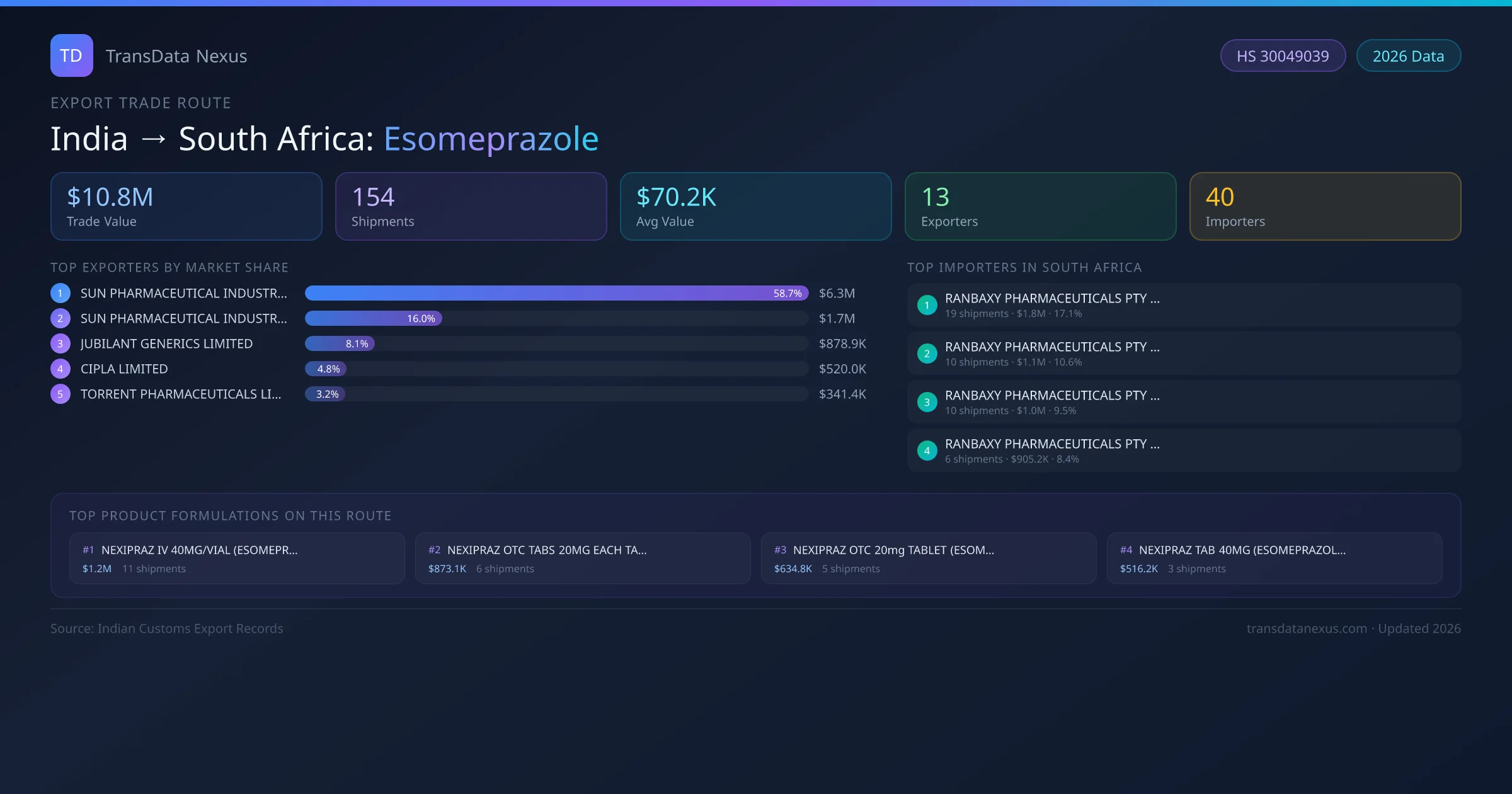 The India to South Africa Esomeprazole corridor is one of India's established pharmaceutical export routes, with 154 shipments documented worth a combined $10.8M USD. The route is dominated by SUN PHARMACEUTICAL INDUSTRIES LIMITED, which alone accounts for roughly 59% of all export value, reflecting the consolidated nature of India's esomeprazole manufacturing sector.