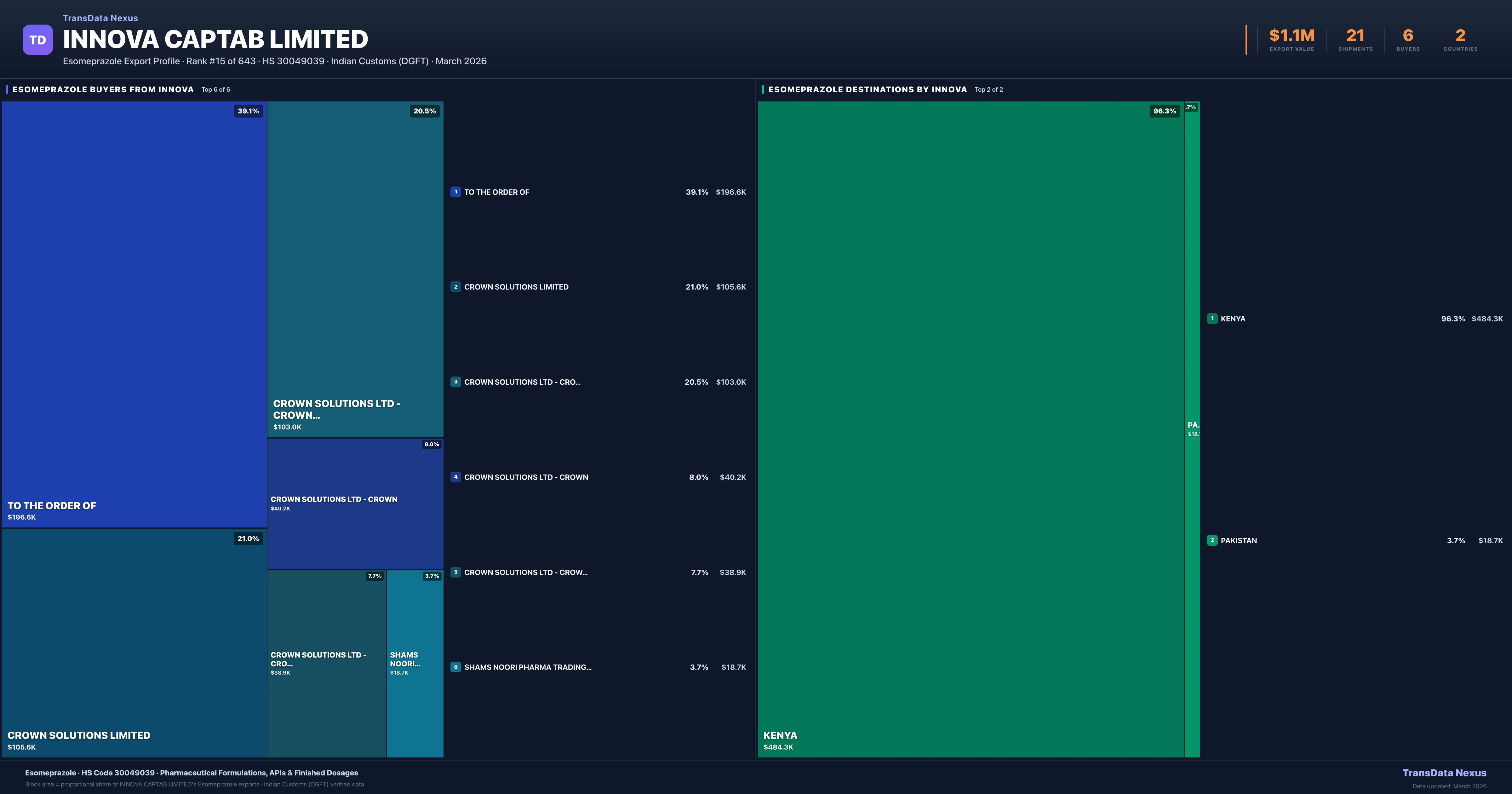 Innova Captab Limited supplies Esomeprazole to 6 buyers globally. The largest buyer is TO THE ORDER OF (KENYA), followed by CROWN SOLUTIONS LIMITED (KENYA) and CROWN SOLUTIONS LTD - CROWN HEALTH (KENYA). These buyers represent pharmaceutical distributors, hospital groups, and government procurement agencies in their respective markets.