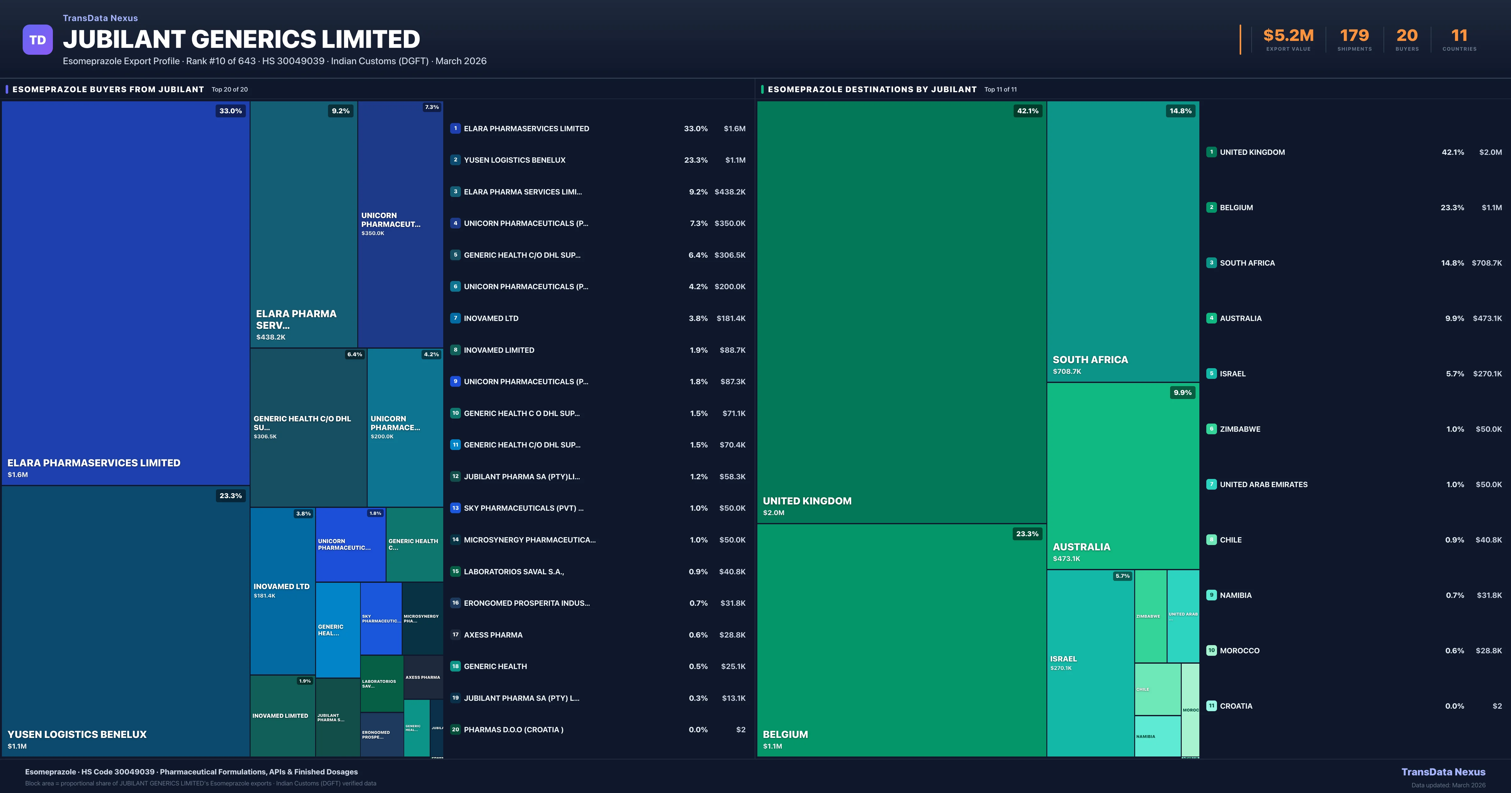 - 4.Verified Records: This page is backed by 182 individual customs records matching Jubilant Generics Limited exporting Esomeprazole, covering 111 formulations to 11 countries via 20 buyers.