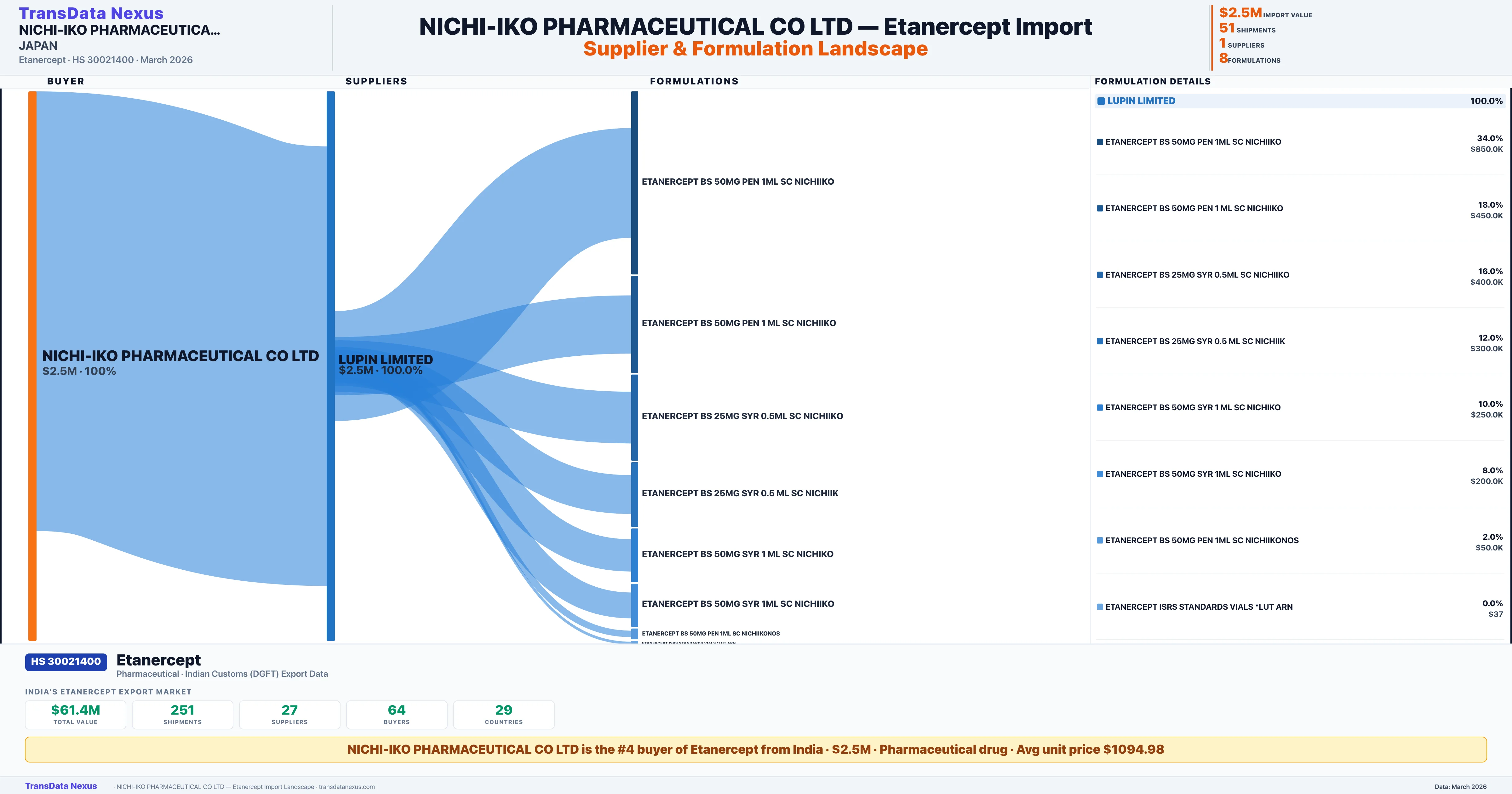 NICHI-IKO PHARMACEUTICAL CO LTD sources Etanercept from 1 verified Indian supplier based on 51 customs records. The primary supplier is LUPIN LIMITED accounting for 100.0% of imports.