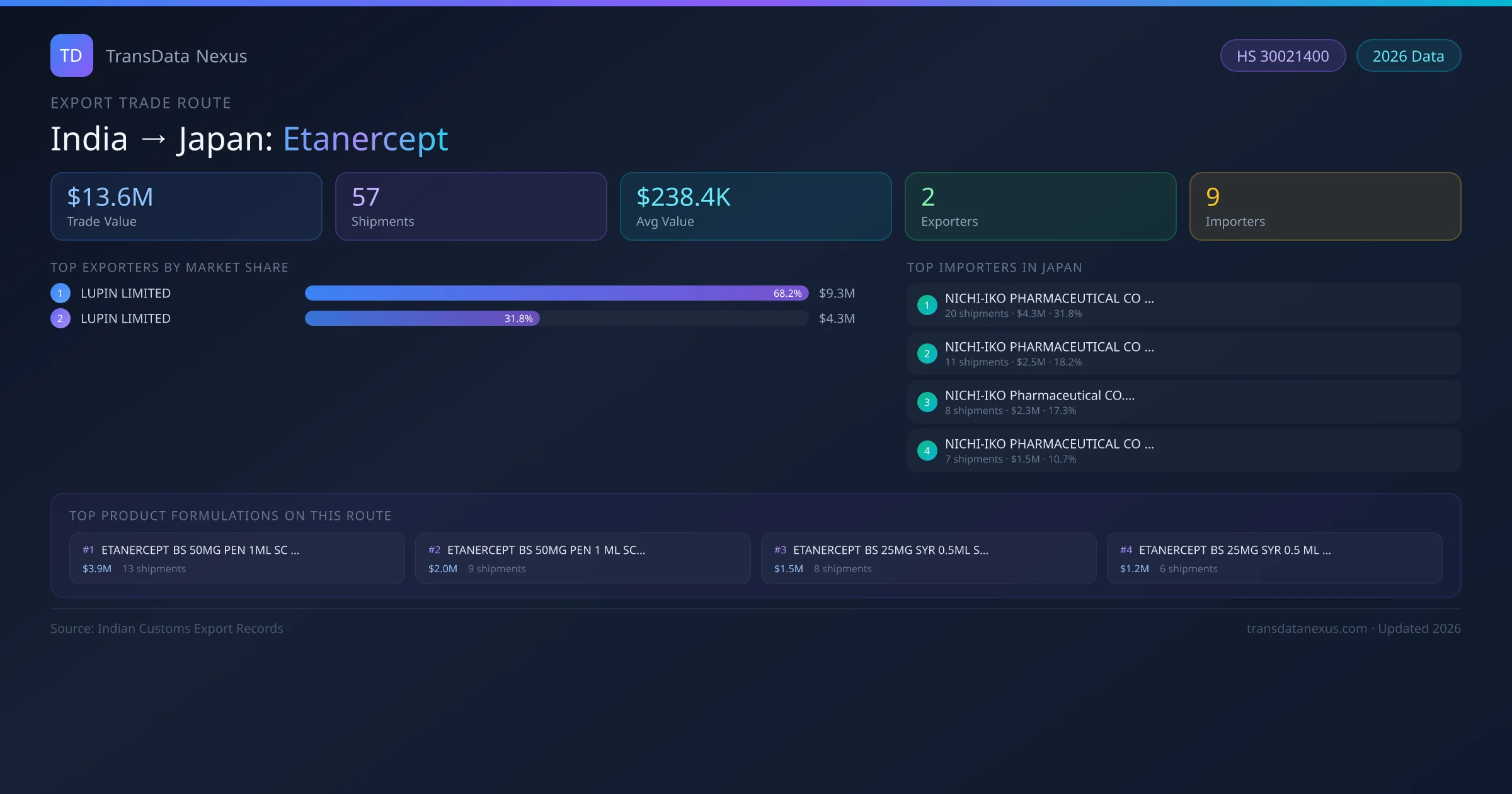 The leading Indian exporters of Etanercept to Japan are LUPIN LIMITED, LUPIN LIMITED . LUPIN LIMITED holds the largest market share at approximately 68% of total trade value on this route.