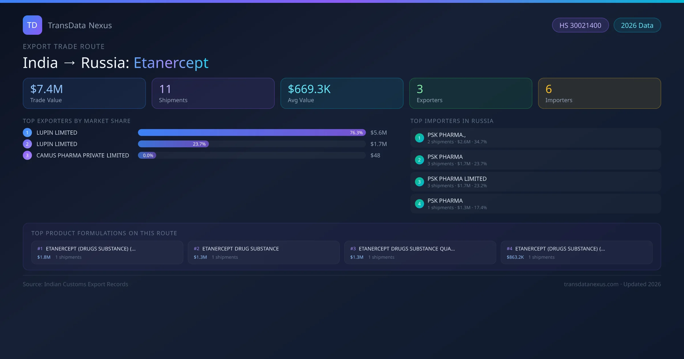 India has recorded 11 verified shipments of Etanercept exported to Russia, representing a combined trade value of $7.4M USD. This corridor is served by 3 active Indian exporters, with an average shipment value of $669.3K USD. The leading Indian exporter is LUPIN LIMITED, which accounts for 76% of total export value with 7 shipments worth $5.6M USD. On the buying side, PSK PHARMA., is the largest importer in Russia with $2.6M USD in purchases. The top 3 suppliers — LUPIN LIMITED, LUPIN LIMITED , CAMUS PHARMA PRIVATE LIMITED — together control 100% of total trade value on this route. All data sourced from Indian Customs (DGFT) shipping bill records. Values reported in FOB USD.