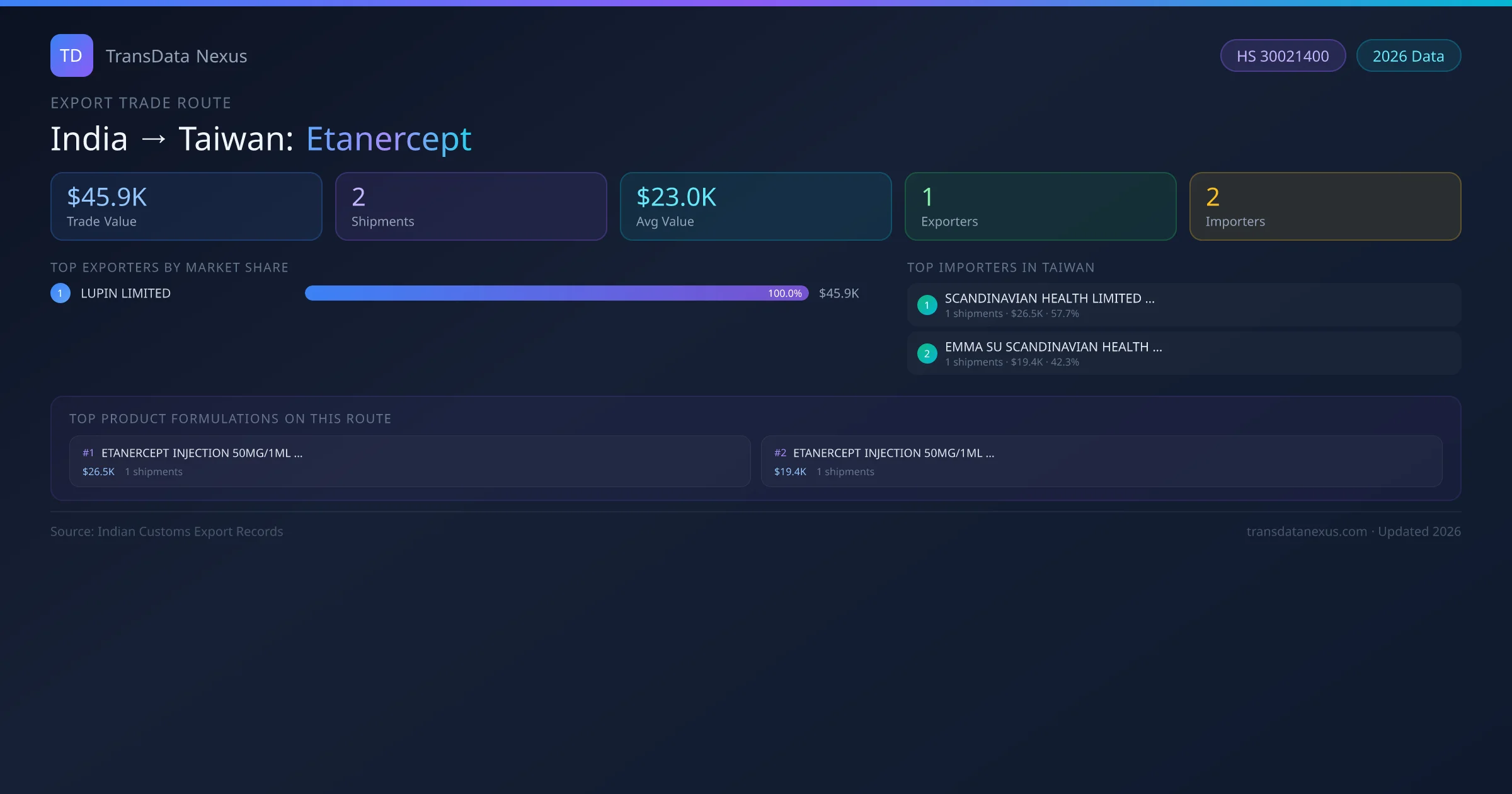 India has recorded 2 verified shipments of Etanercept exported to Taiwan, representing a combined trade value of $45.9K USD. This corridor is served by 1 active Indian exporters, with an average shipment value of $23.0K USD. The leading Indian exporter is LUPIN LIMITED, which accounts for 100% of total export value with 2 shipments worth $45.9K USD. On the buying side, SCANDINAVIAN HEALTH LIMITED (SHL) is the largest importer in Taiwan with $26.5K USD in purchases. All data sourced from Indian Customs (DGFT) shipping bill records. Values reported in FOB USD.