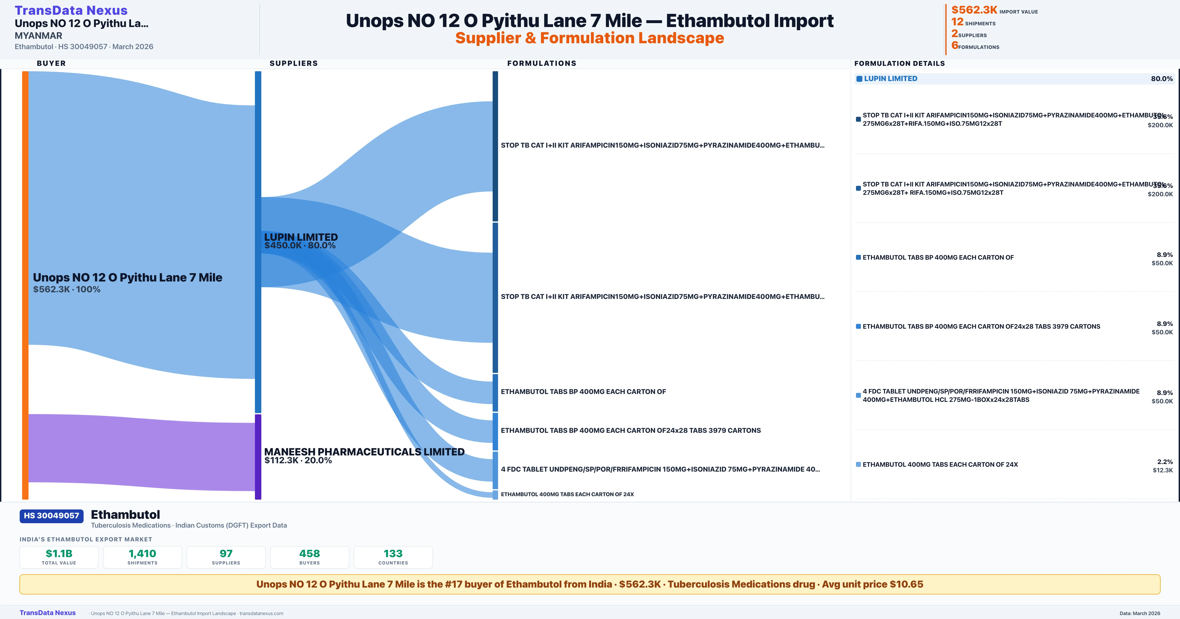 UNOPS NO 12 O PYITHU LANE 7 MILE sources Ethambutol from 2 verified Indian suppliers based on 12 customs records. The primary supplier is LUPIN LIMITED accounting for 80.0% of imports.
