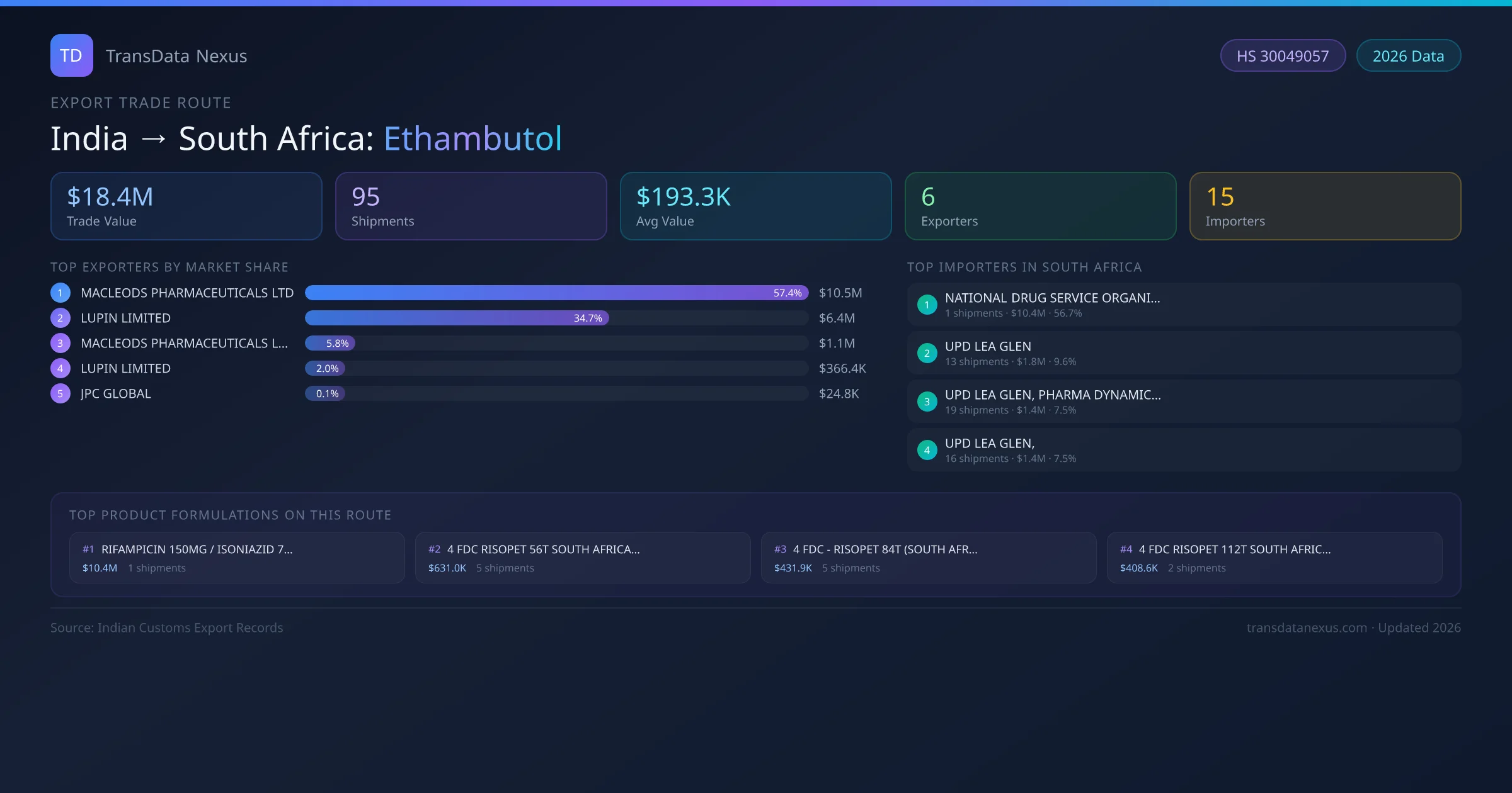 India has recorded 95 verified shipments of Ethambutol exported to South Africa, representing a combined trade value of $18.4M USD. This corridor is served by 6 active Indian exporters, with an average shipment value of $193.3K USD. The leading Indian exporter is MACLEODS PHARMACEUTICALS LTD, which accounts for 57% of total export value with 5 shipments worth $10.5M USD. On the buying side, NATIONAL DRUG SERVICE ORGANISATION is the largest importer in South Africa with $10.4M USD in purchases. The top 3 suppliers — MACLEODS PHARMACEUTICALS LTD, LUPIN LIMITED, MACLEODS PHARMACEUTICALS LIMITED — together control 98% of total trade value on this route. All data sourced from Indian Customs (DGFT) shipping bill records. Values reported in FOB USD.