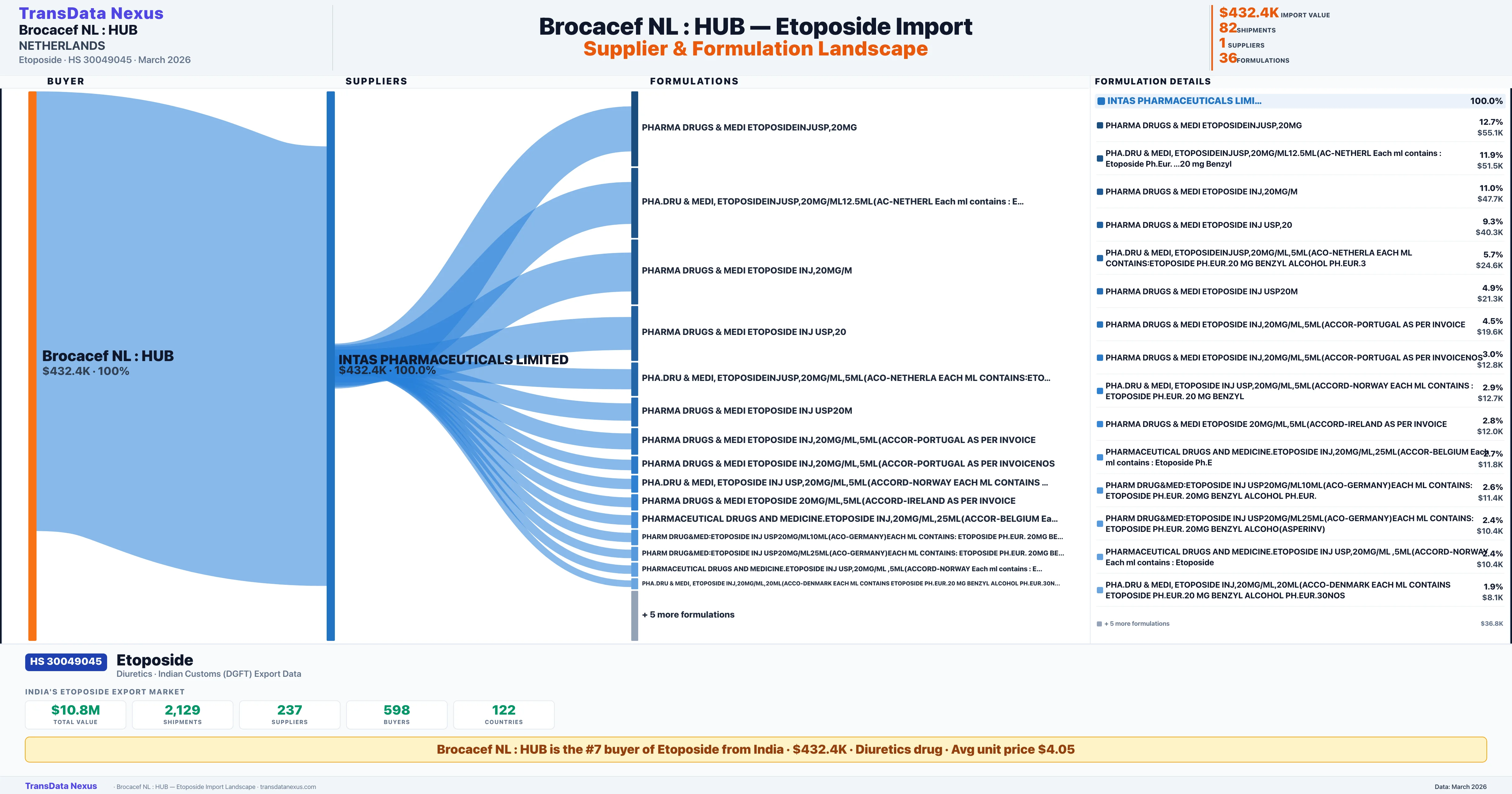 BROCACEF NL : HUB sources Etoposide from 1 verified Indian supplier: INTAS PHARMACEUTICALS LIMITED ($432.4K, 100.0%). This is based on 82 customs records.