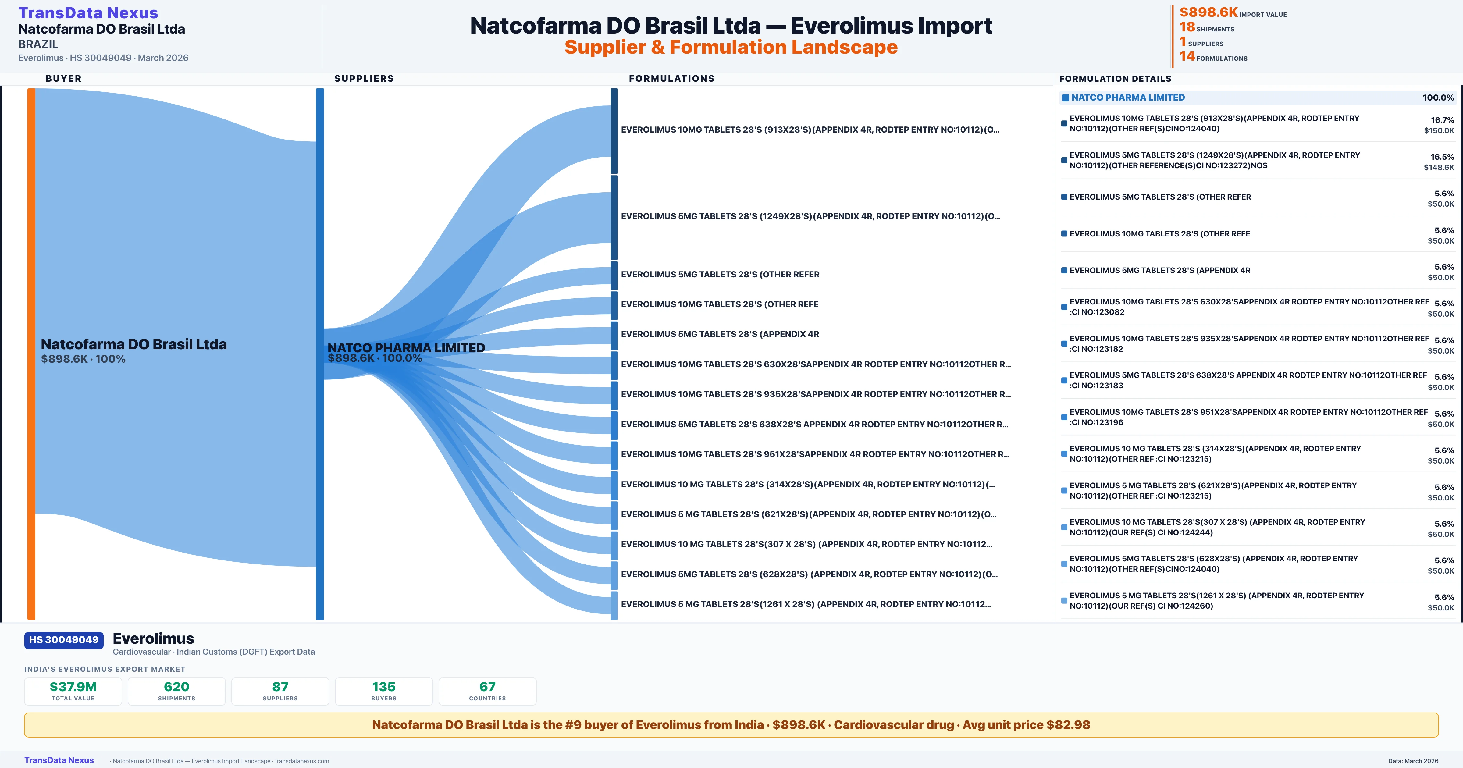 NATCOFARMA DO BRASIL LTDA, sources Everolimus from 1 verified Indian supplier: NATCO PHARMA LIMITED ($898.6K, 100.0%). This is based on 18 customs records.
