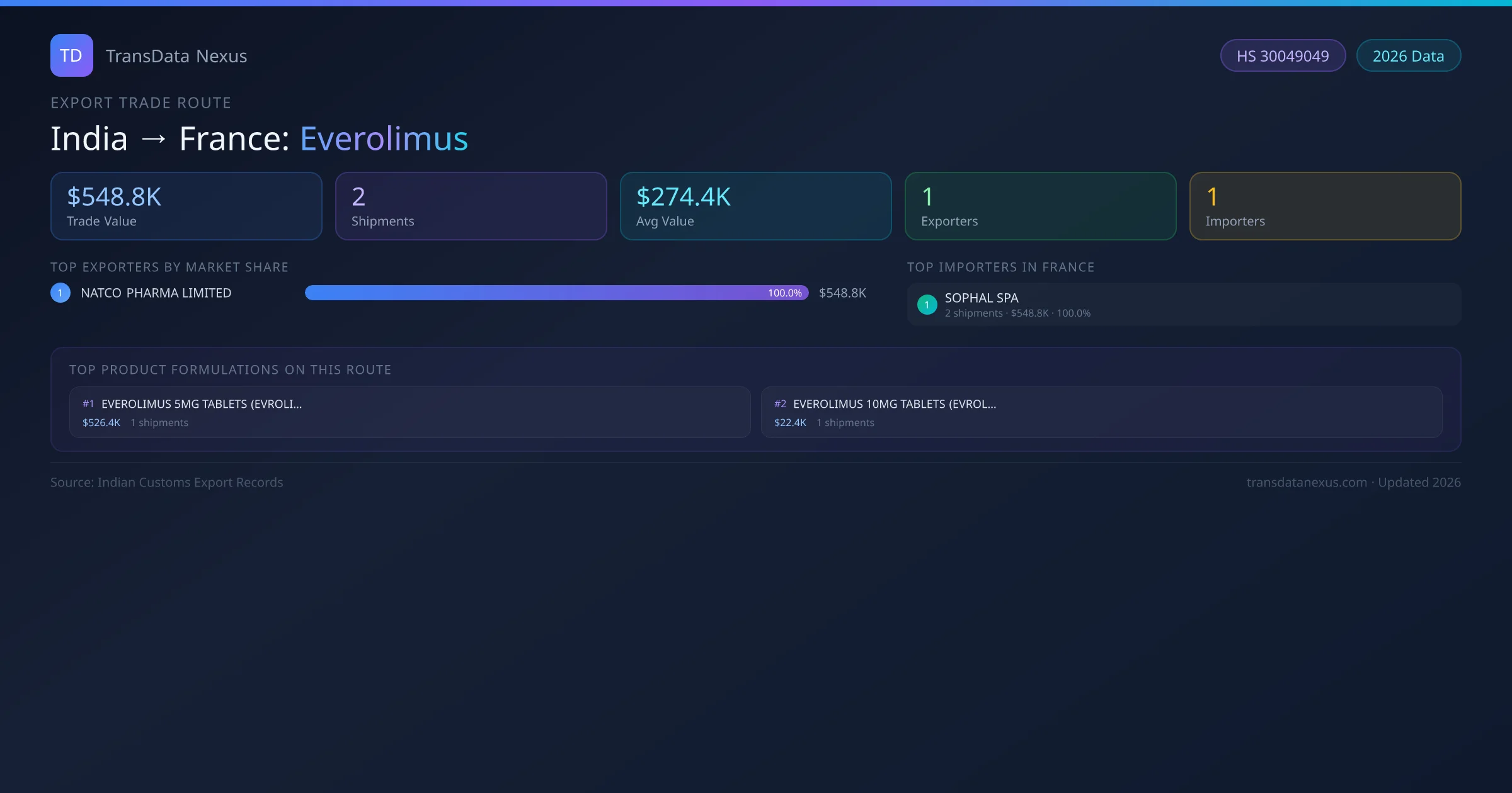 India has recorded 2 verified shipments of Everolimus exported to France, representing a combined trade value of $548.8K USD. This corridor is served by 1 active Indian exporters, with an average shipment value of $274.4K USD. The leading Indian exporter is NATCO PHARMA LIMITED, which accounts for 100% of total export value with 2 shipments worth $548.8K USD. On the buying side, SOPHAL SPA is the largest importer in France with $548.8K USD in purchases. All data sourced from Indian Customs (DGFT) shipping bill records. Values reported in FOB USD.