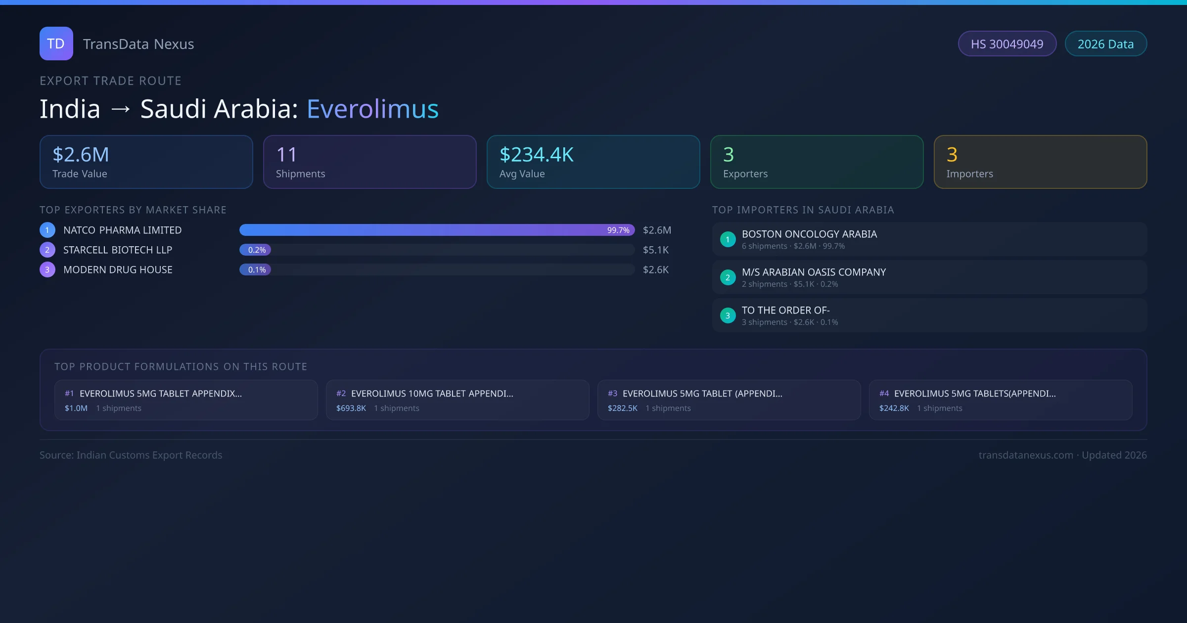 The India to Saudi Arabia Everolimus corridor is one of India's established pharmaceutical export routes, with 11 shipments documented worth a combined $2.6M USD. The route is dominated by NATCO PHARMA LIMITED, which alone accounts for roughly 100% of all export value, reflecting the consolidated nature of India's everolimus manufacturing sector.