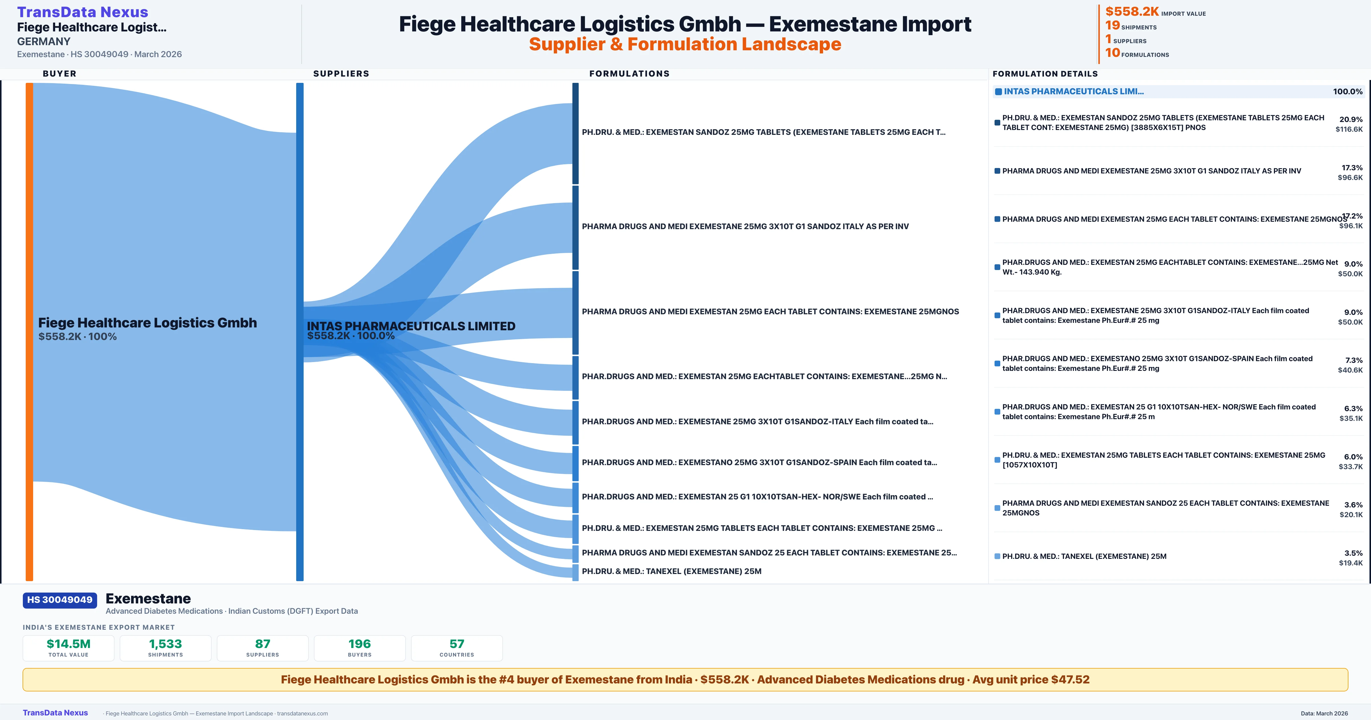 FIEGE HEALTHCARE LOGISTICS GMBH sources Exemestane from 1 verified Indian supplier: INTAS PHARMACEUTICALS LIMITED ($558.2K, 100.0%). This is based on 19 customs records.