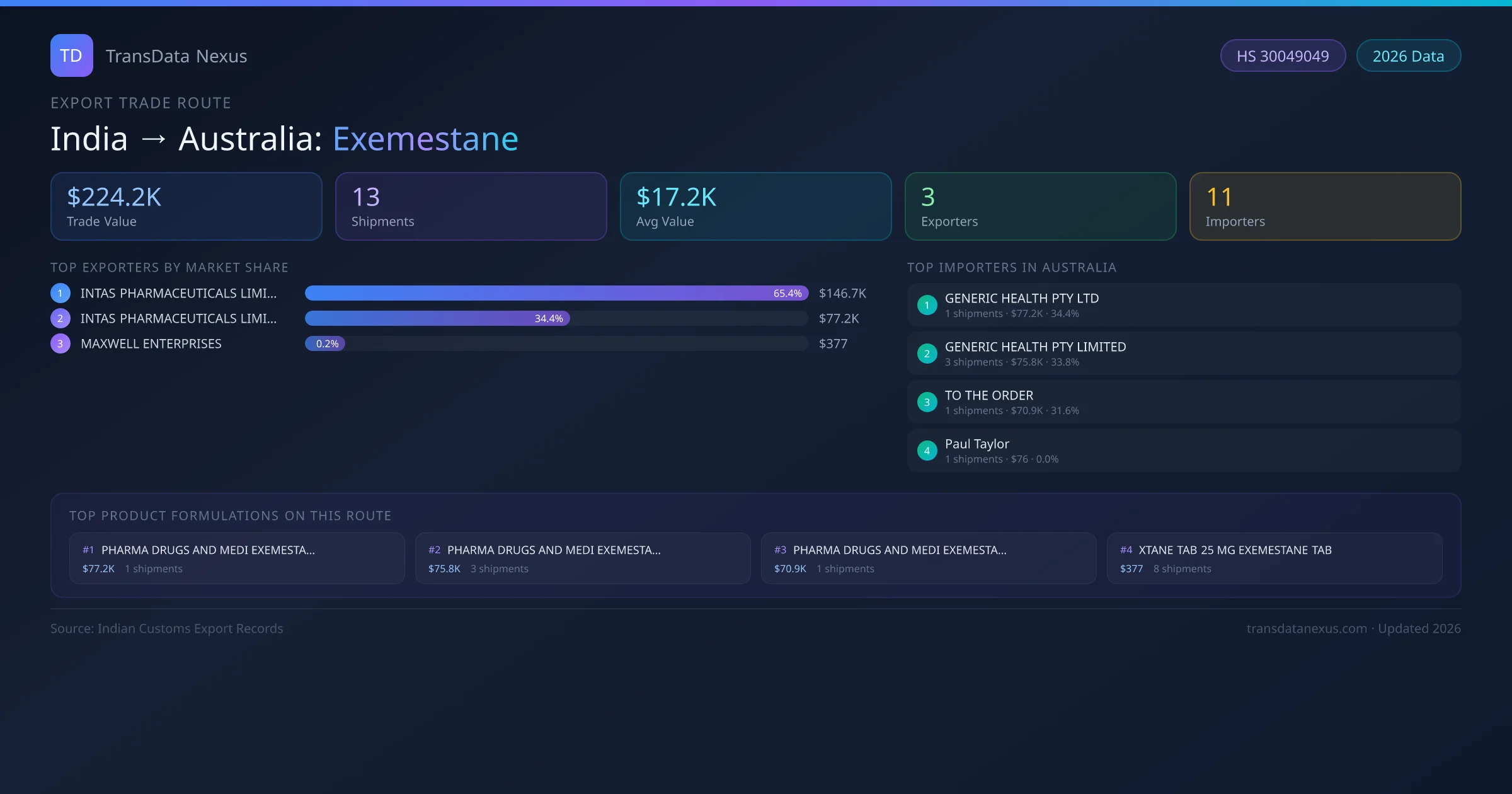The India to Australia Exemestane corridor is one of India's established pharmaceutical export routes, with 13 shipments documented worth a combined $224.2K USD. The route is dominated by INTAS PHARMACEUTICALS LIMITED, which alone accounts for roughly 65% of all export value, reflecting the consolidated nature of India's exemestane manufacturing sector.