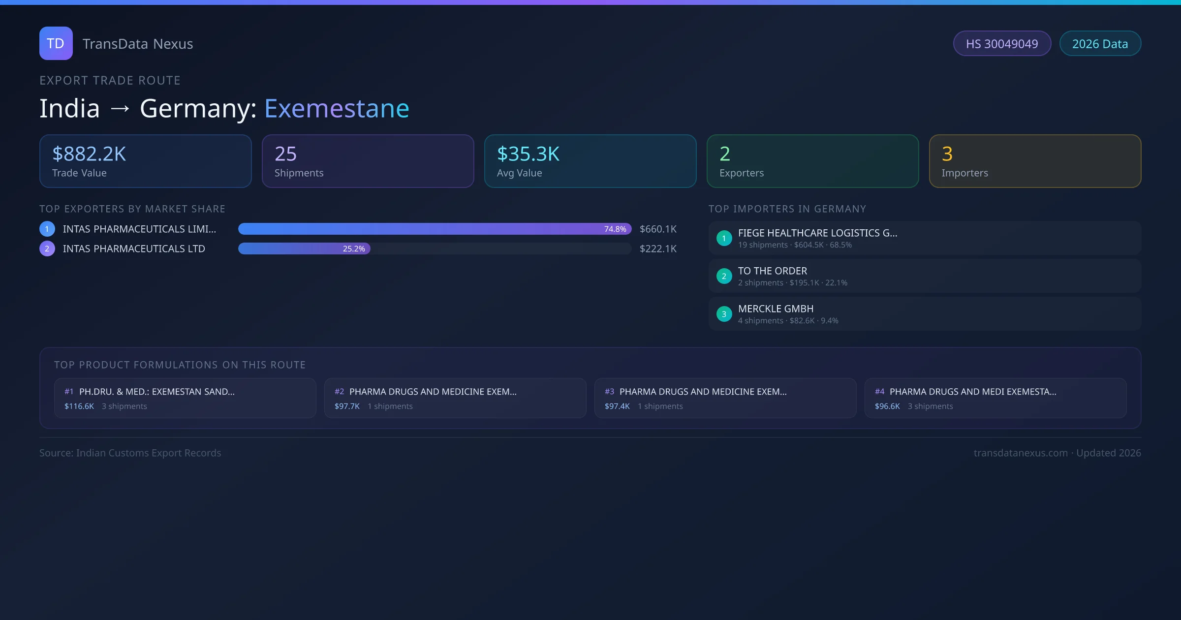 The India to Germany Exemestane corridor is one of India's established pharmaceutical export routes, with 25 shipments documented worth a combined $882.2K USD. The route is dominated by INTAS PHARMACEUTICALS LIMITED, which alone accounts for roughly 75% of all export value, reflecting the consolidated nature of India's exemestane manufacturing sector.