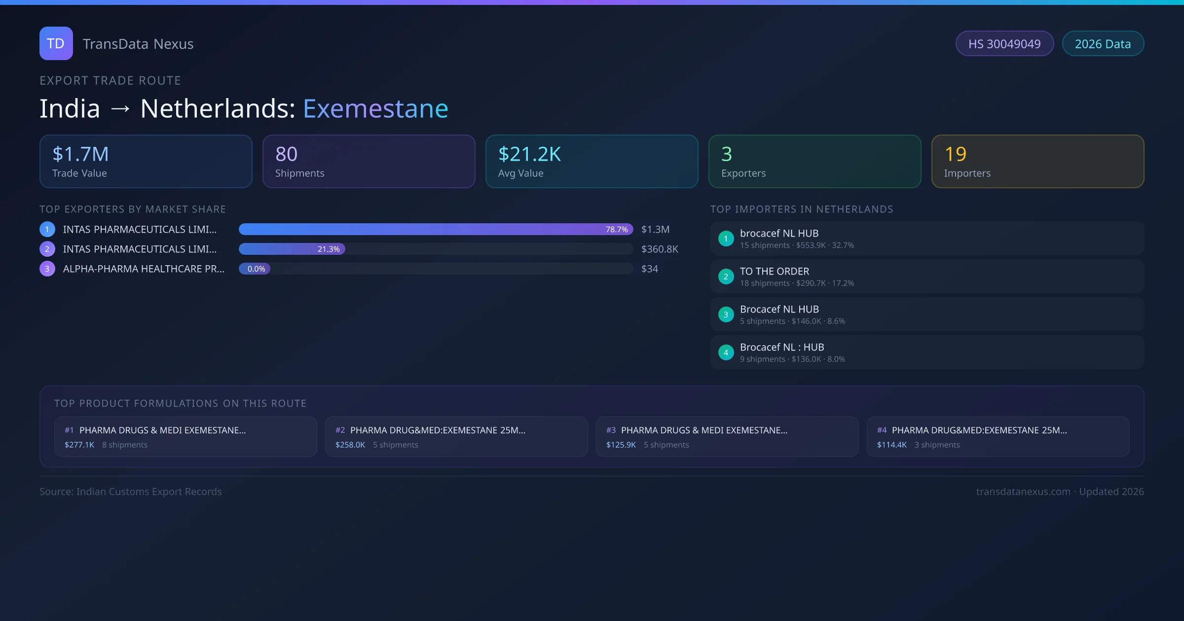 India has recorded 80 verified shipments of Exemestane exported to Netherlands, representing a combined trade value of $1.7M USD. This corridor is served by 3 active Indian exporters, with an average shipment value of $21.2K USD. The leading Indian exporter is INTAS PHARMACEUTICALS LIMITED, which accounts for 79% of total export value with 58 shipments worth $1.3M USD. On the buying side, brocacef NL HUB is the largest importer in Netherlands with $553.9K USD in purchases. The top 3 suppliers — INTAS PHARMACEUTICALS LIMITED, INTAS PHARMACEUTICALS LIMITED , ALPHA-PHARMA HEALTHCARE PRIVATE LIMITED — together control 100% of total trade value on this route. All data sourced from Indian Customs (DGFT) shipping bill records. Values reported in FOB USD.