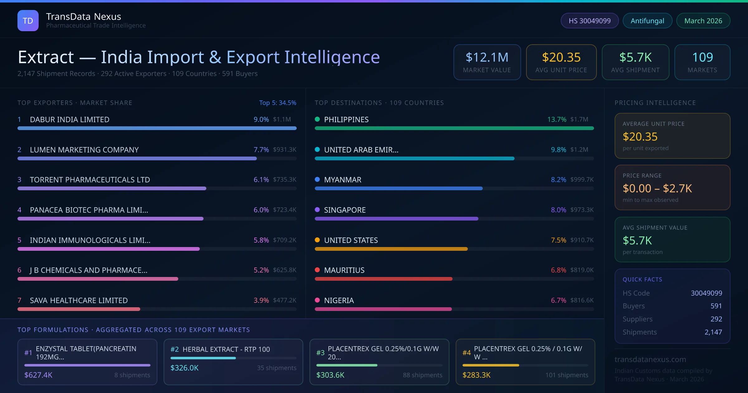All trade data is sourced from Indian Customs (DGFT) official shipping bill records — the authoritative government database for India's pharmaceutical trade. Each verified record contains exporter name, consignee (buyer) name, detailed product description, quantity, declared FOB value (USD), port of loading, destination country, and shipment date.