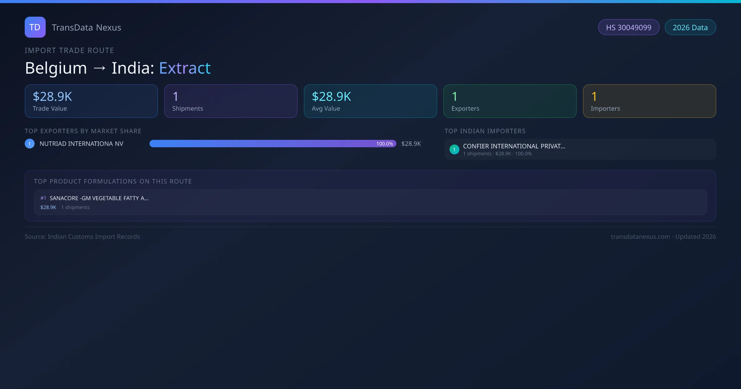 The Belgium to India Extract corridor is one of India's established pharmaceutical import routes from Belgium, with 1 shipments documented worth a combined $28.9K USD. The route is dominated by NUTRIAD INTERNATIONA NV , which alone accounts for roughly 100% of all import value, reflecting the consolidated nature of Belgium's extract export sector.