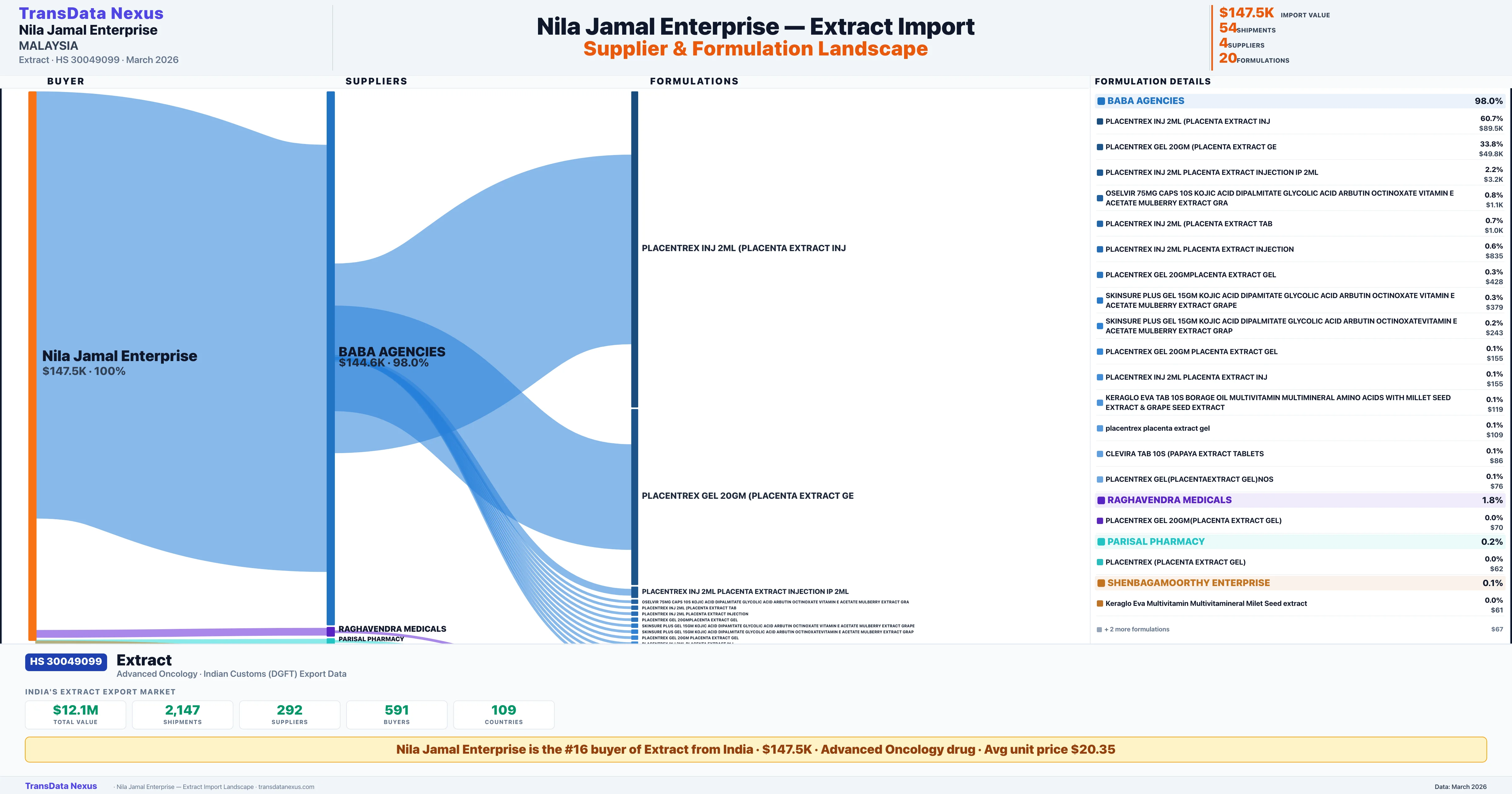 NILA JAMAL ENTERPRISE sources Extract from 4 verified Indian suppliers: BABA AGENCIES ($144.6K, 98.0%), RAGHAVENDRA MEDICALS ($2.6K, 1.8%), PARISAL PHARMACY ($232, 0.2%), SHENBAGAMOORTHY ENTERPRISE ($76, 0.1%). This is based on 54 customs records.