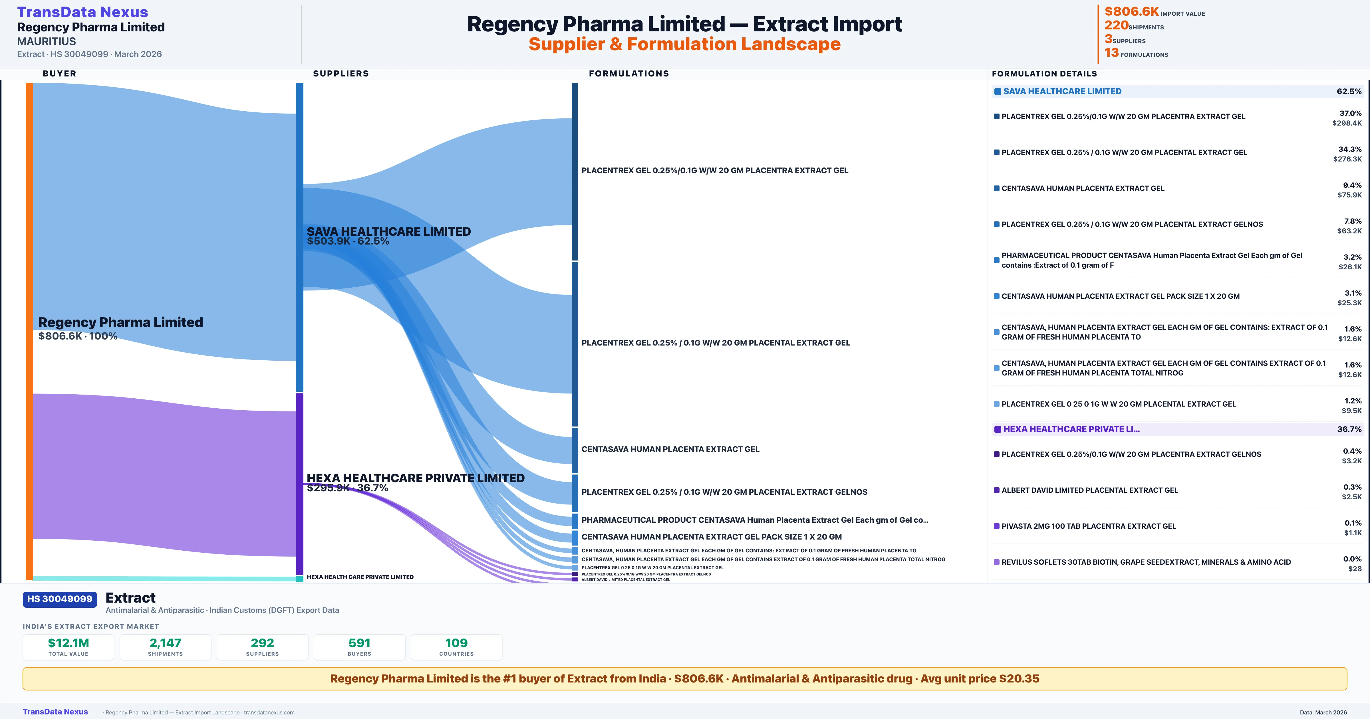 REGENCY PHARMA LIMITED sources Extract from 3 verified Indian suppliers: SAVA HEALTHCARE LIMITED ($503.9K, 62.5%), HEXA HEALTHCARE PRIVATE LIMITED ($295.9K, 36.7%), HEXA HEALTH CARE PRIVATE LIMITED ($6.8K, 0.8%). This is based on 220 customs records.