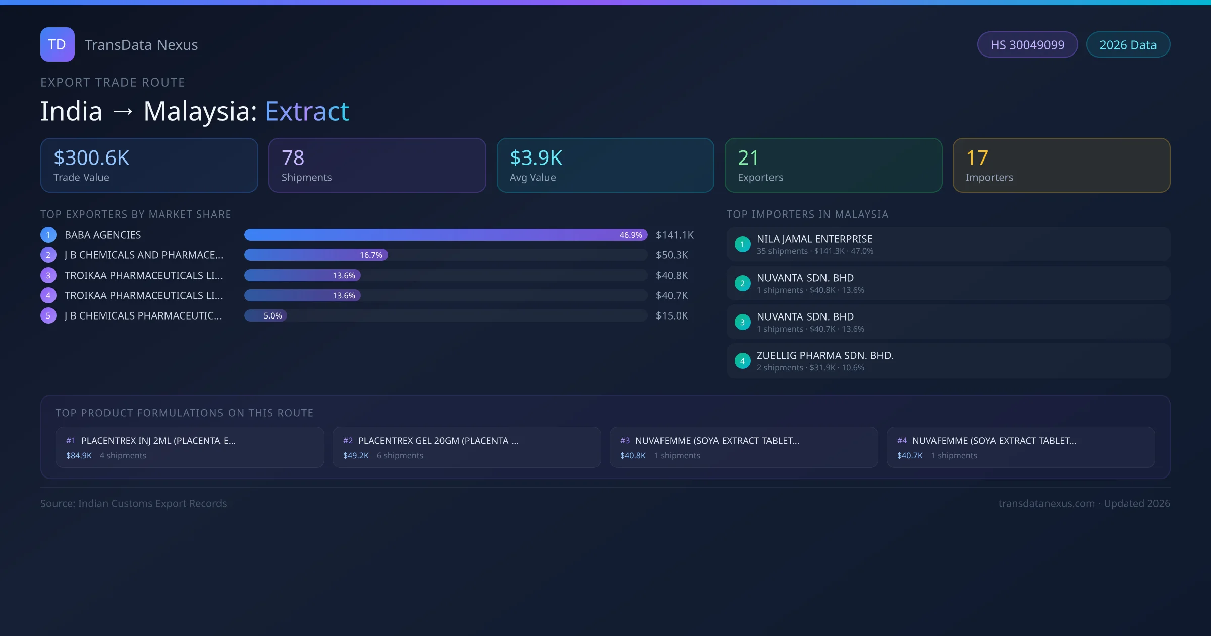 India has recorded 78 verified shipments of Extract exported to Malaysia, representing a combined trade value of $300.6K USD. This corridor is served by 21 active Indian exporters, with an average shipment value of $3.9K USD. The leading Indian exporter is BABA AGENCIES, which accounts for 47% of total export value with 32 shipments worth $141.1K USD. On the buying side, NILA JAMAL ENTERPRISE is the largest importer in Malaysia with $141.3K USD in purchases. The top 3 suppliers — BABA AGENCIES, J B CHEMICALS AND PHARMACEUTICALS LIMITED, TROIKAA PHARMACEUTICALS LIMITED — together control 77% of total trade value on this route. All data sourced from Indian Customs (DGFT) shipping bill records. Values reported in FOB USD.