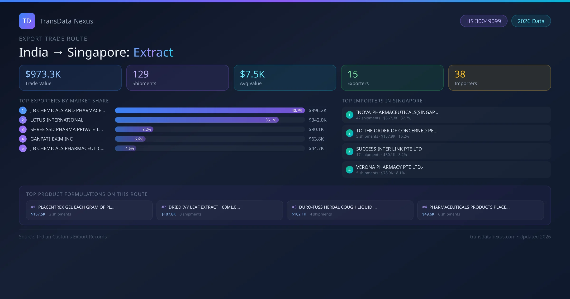 India has recorded 129 verified shipments of Extract exported to Singapore, representing a combined trade value of $973.3K USD. This corridor is served by 15 active Indian exporters, with an average shipment value of $7.5K USD. The leading Indian exporter is J B CHEMICALS AND PHARMACEUTICALS LIMITED, which accounts for 41% of total export value with 46 shipments worth $396.2K USD. On the buying side, INOVA PHARMACEUTICALS(SINGAPORE) PT is the largest importer in Singapore with $367.3K USD in purchases. The top 3 suppliers — J B CHEMICALS AND PHARMACEUTICALS LIMITED, LOTUS INTERNATIONAL, SHREE SSD PHARMA PRIVATE LIMITED — together control 84% of total trade value on this route. All data sourced from Indian Customs (DGFT) shipping bill records. Values reported in FOB USD.