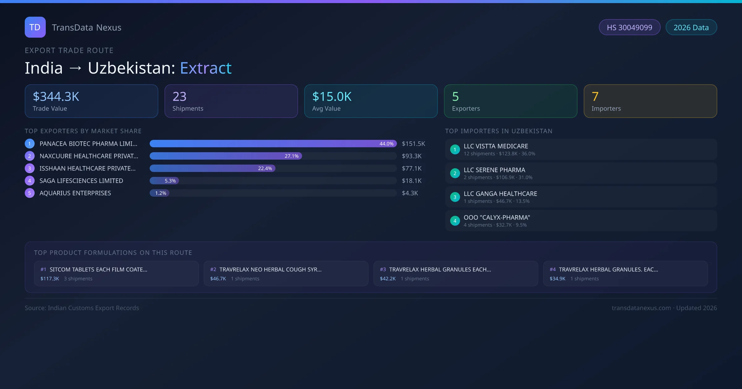 The India to Uzbekistan Extract corridor is one of India's established pharmaceutical export routes, with 23 shipments documented worth a combined $344.3K USD. The route is dominated by PANACEA BIOTEC PHARMA LIMITED, which alone accounts for roughly 44% of all export value, reflecting the consolidated nature of India's extract manufacturing sector.