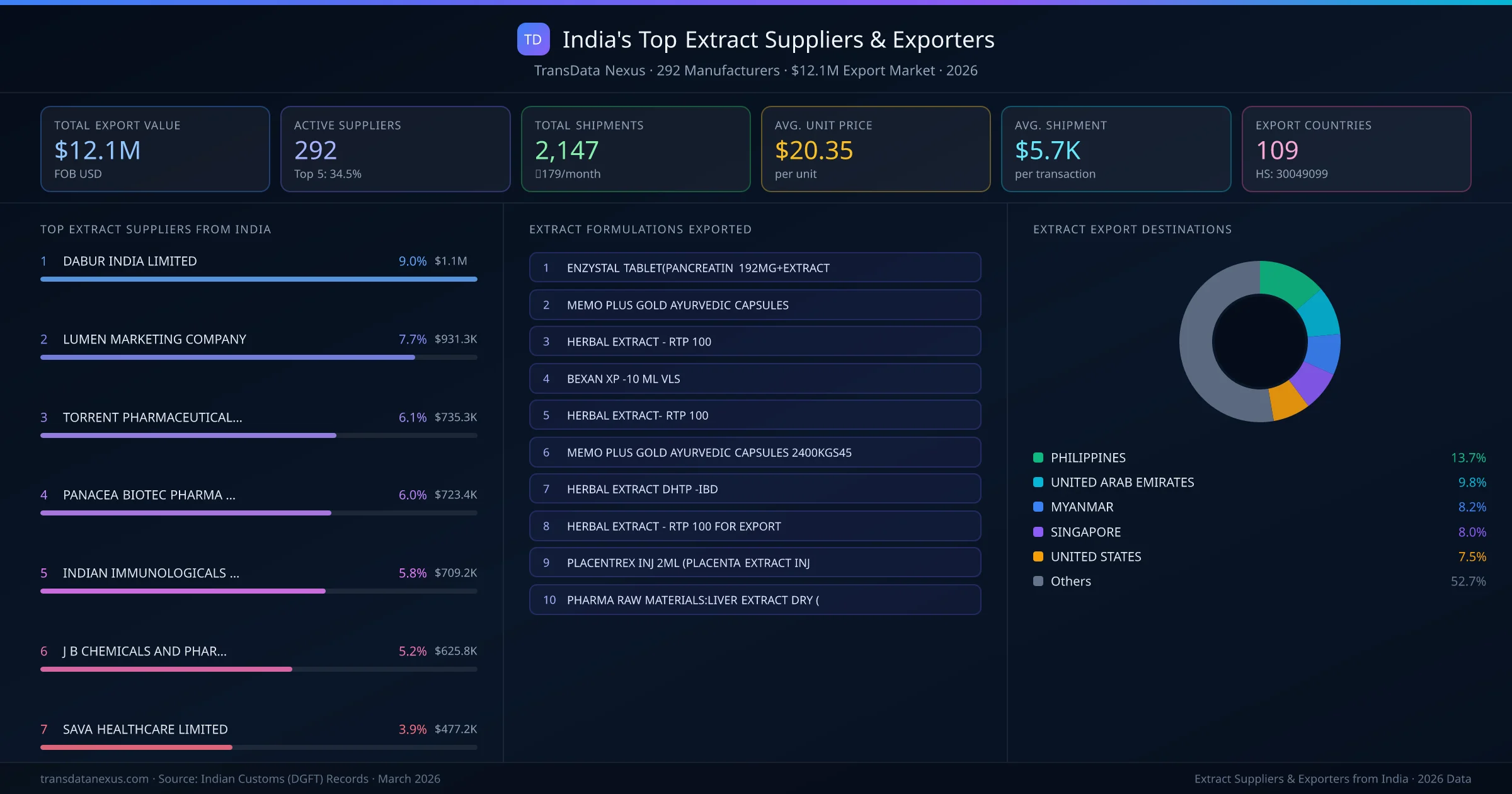 DABUR INDIA LIMITED is the leading extract exporter from India, holding a 9.0% share of the $12.1M market across 2,147 shipments from 292 exporters. The top 5 suppliers β DABUR INDIA LIMITED, LUMEN MARKETING COMPANY, TORRENT PHARMACEUTICALS LTD, PANACEA BIOTEC PHARMA LIMITED, INDIAN IMMUNOLOGICALS LIMITED β collectively control 34.5% of total export value, indicating a competitive market. Individual shares are: DABUR INDIA LIMITED (9.0%), LUMEN MARKETING COMPANY (7.7%), TORRENT PHARMACEUTICALS LTD (6.1%), PANACEA BIOTEC PHARMA LIMITED (6.0%), INDIAN IMMUNOLOGICALS LIMITED (5.8%).