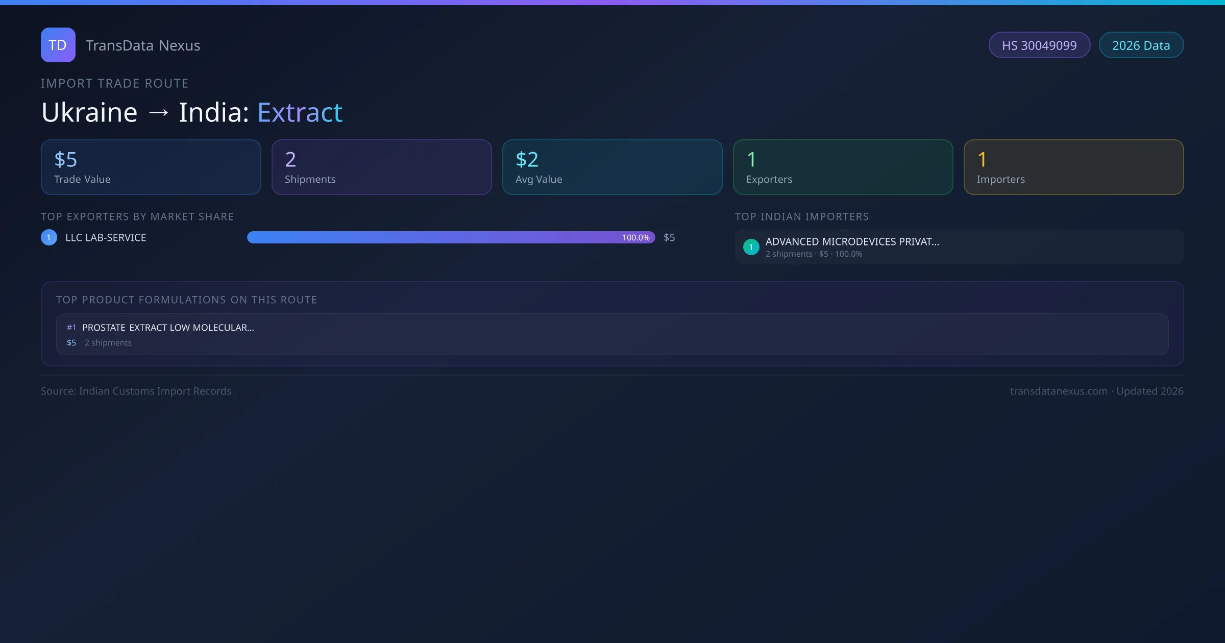 The Ukraine to India Extract corridor is one of India's established pharmaceutical import routes from Ukraine, with 2 shipments documented worth a combined $5 USD. The route is dominated by LLC LAB-SERVICE , which alone accounts for roughly 100% of all import value, reflecting the consolidated nature of Ukraine's extract export sector.