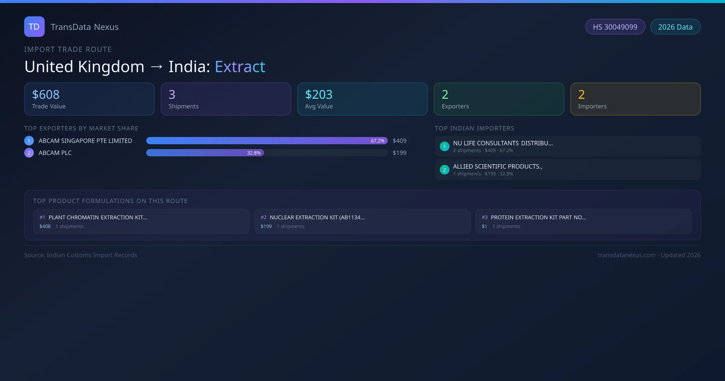 India has recorded 3 verified shipments of Extract imported from United Kingdom, representing a combined trade value of $608 USD. This corridor is served by 2 active United Kingdom exporters, with an average shipment value of $203 USD. The leading United Kingdom supplier is ABCAM SINGAPORE PTE LIMITED, which accounts for 67% of total import value with 2 shipments worth $409 USD. On the buying side, NU LIFE CONSULTANTS DISTRIBUTORS PRIVATE LIMITED is the largest Indian importer with $409 USD in purchases. All data sourced from Indian Customs (DGFT) shipping bill of entry records. Values reported in FOB USD.