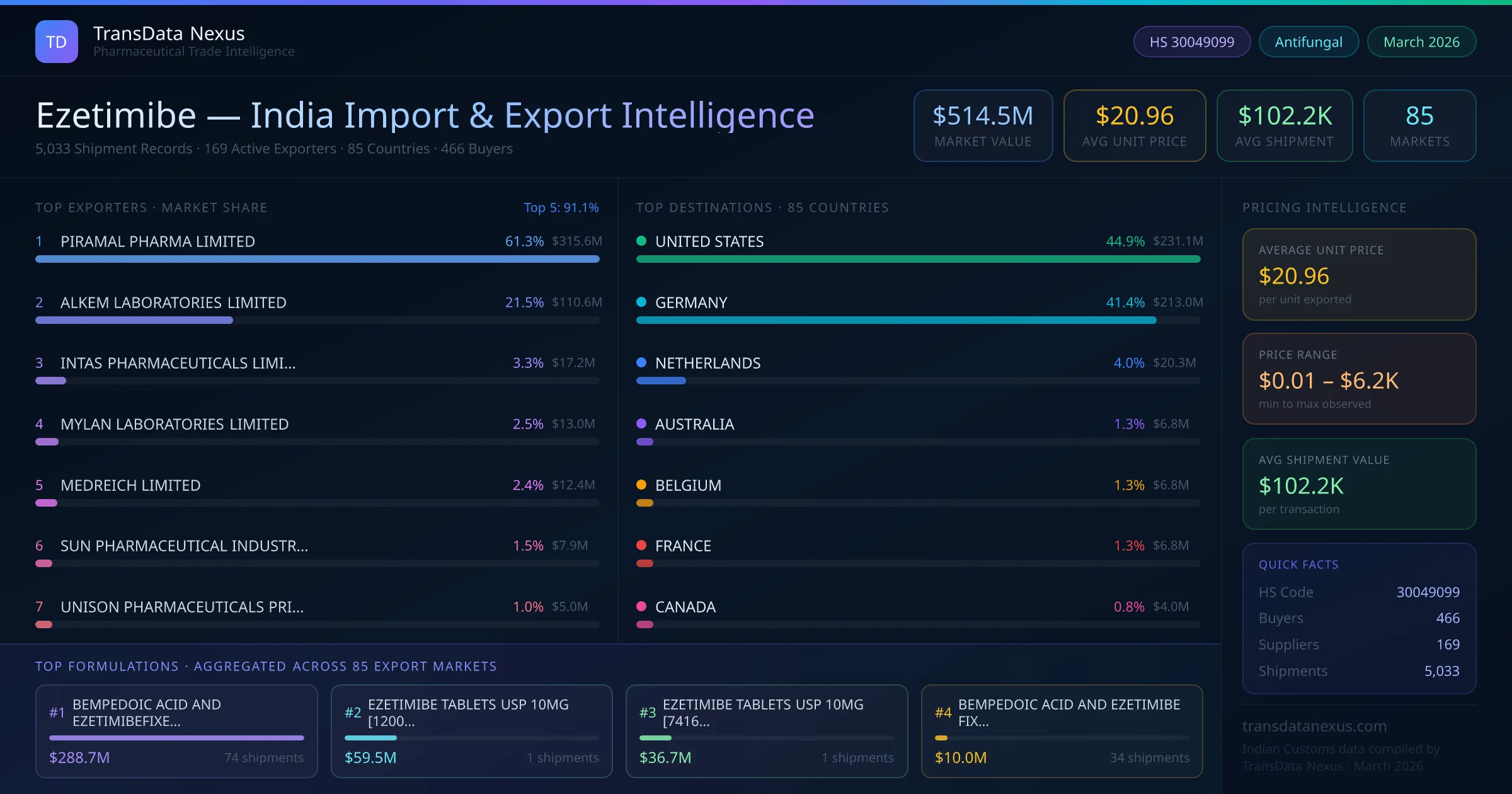 Between 2022 and 2026, India exported $514.5M worth of ezetimibe across 5,033 verified shipments to 85 countries — covering 44% of world markets in the Lipid & Metabolism segment. The largest destination is UNITED STATES (44.9%). PIRAMAL PHARMA LIMITED leads with a 61.3% share. All figures are drawn from Indian Customs (DGFT) shipping bill records spanning four years of trade activity.