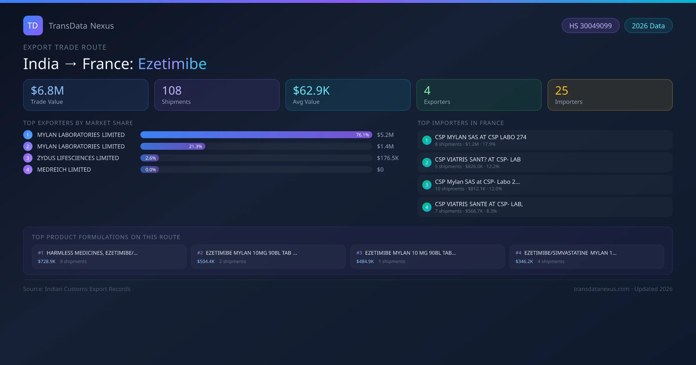 India has recorded 108 verified shipments of Ezetimibe exported to France, representing a combined trade value of $6.8M USD. This corridor is served by 4 active Indian exporters, with an average shipment value of $62.9K USD. The leading Indian exporter is MYLAN LABORATORIES LIMITED, which accounts for 76% of total export value with 64 shipments worth $5.2M USD. On the buying side, CSP MYLAN SAS AT CSP LABO 274 is the largest importer in France with $1.2M USD in purchases. The top 3 suppliers — MYLAN LABORATORIES LIMITED, MYLAN LABORATORIES LIMITED , ZYDUS LIFESCIENCES LIMITED — together control 100% of total trade value on this route. All data sourced from Indian Customs (DGFT) shipping bill records. Values reported in FOB USD.