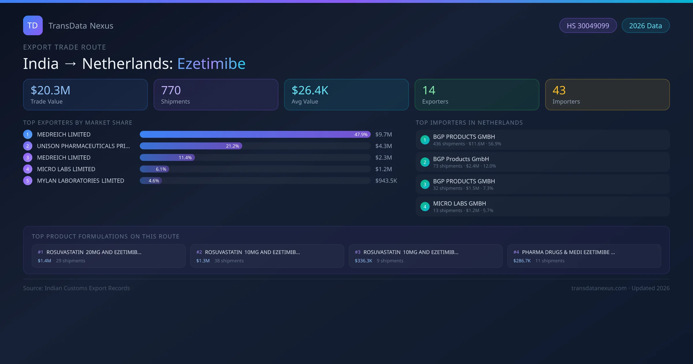 India has recorded 770 verified shipments of Ezetimibe exported to Netherlands, representing a combined trade value of $20.3M USD. This corridor is served by 14 active Indian exporters, with an average shipment value of $26.4K USD. The leading Indian exporter is MEDREICH LIMITED, which accounts for 48% of total export value with 309 shipments worth $9.7M USD. On the buying side, BGP PRODUCTS GMBH is the largest importer in Netherlands with $11.6M USD in purchases. The top 3 suppliers — MEDREICH LIMITED, UNISON PHARMACEUTICALS PRIVATE LIMITED, MEDREICH LIMITED — together control 81% of total trade value on this route. All data sourced from Indian Customs (DGFT) shipping bill records. Values reported in FOB USD.