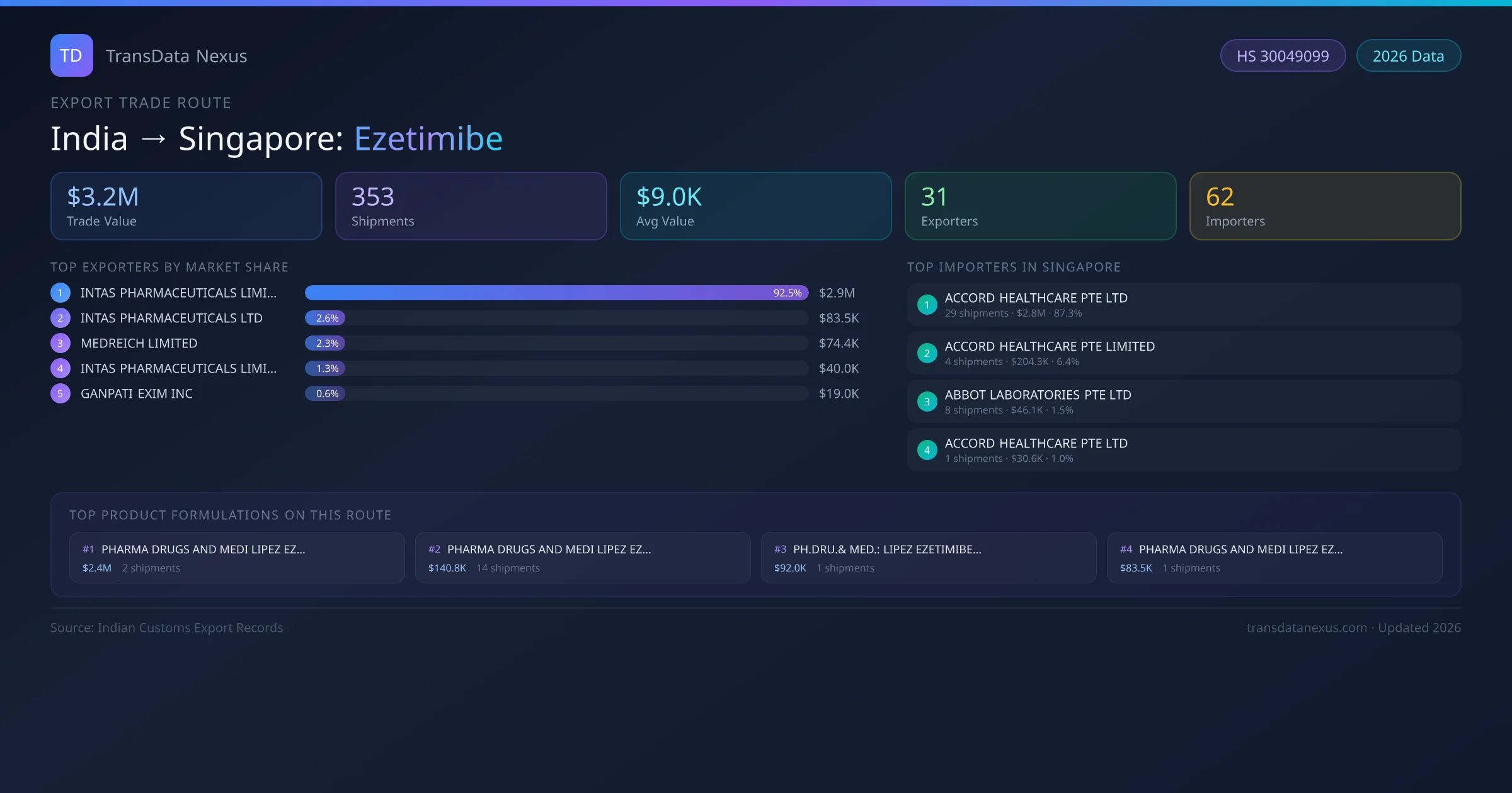 India exports Ezetimibe to Singapore worth approximately $3.2M USD across 353 recorded shipments. The average value per shipment is $9.0K USD.