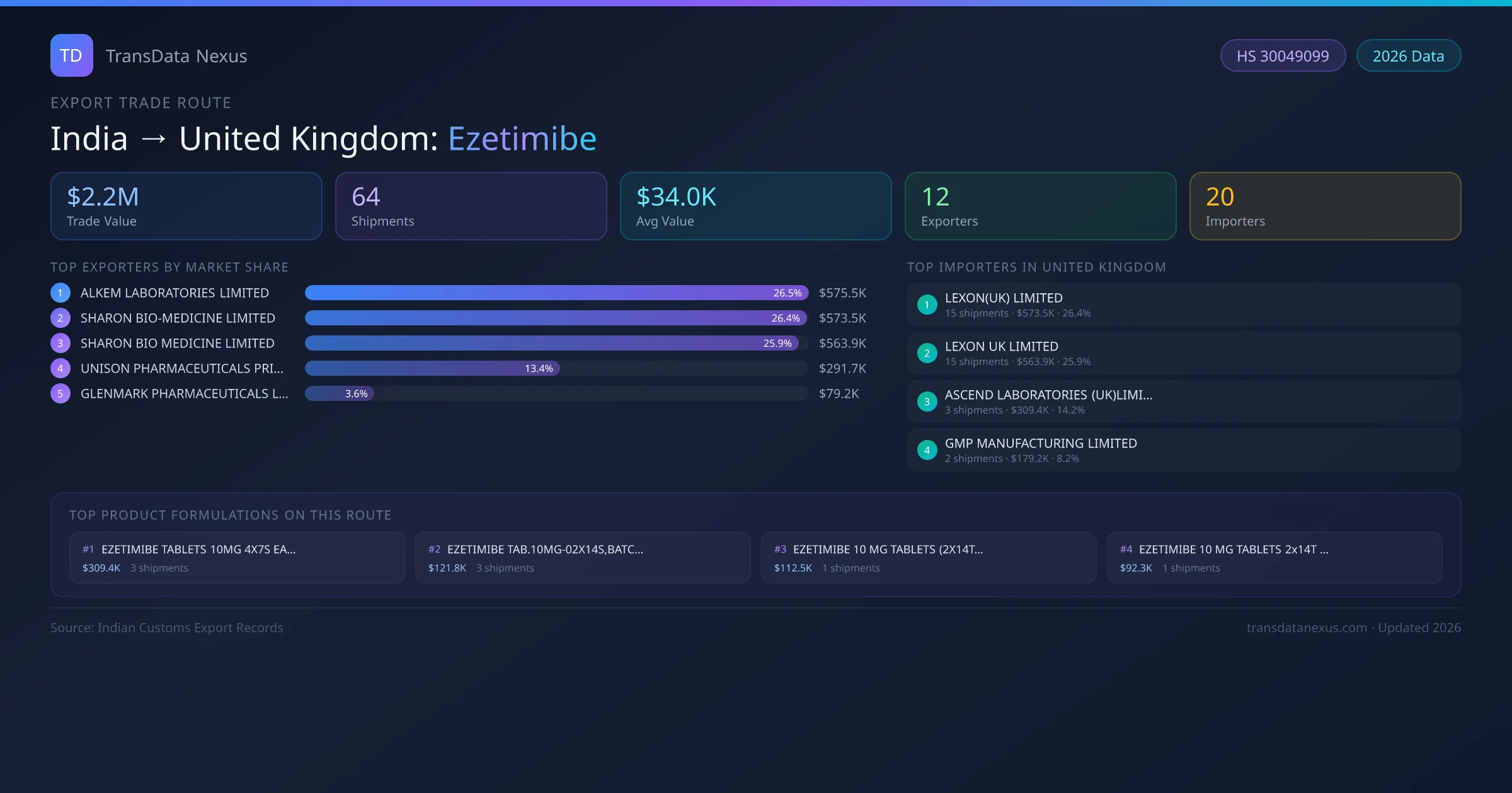 India has recorded 64 verified shipments of Ezetimibe exported to United Kingdom, representing a combined trade value of $2.2M USD. This corridor is served by 12 active Indian exporters, with an average shipment value of $34.0K USD. The leading Indian exporter is ALKEM LABORATORIES LIMITED, which accounts for 26% of total export value with 8 shipments worth $575.5K USD. On the buying side, LEXON(UK) LIMITED is the largest importer in United Kingdom with $573.5K USD in purchases. The top 3 suppliers — ALKEM LABORATORIES LIMITED, SHARON BIO-MEDICINE LIMITED, SHARON BIO MEDICINE LIMITED — together control 79% of total trade value on this route. All data sourced from Indian Customs (DGFT) shipping bill records. Values reported in FOB USD.
